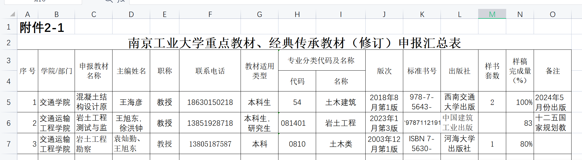 经公司教材建设与管理小组审核,周峰、王海彦、王旭东三位同志政治立场坚定,能坚持正确的学术导向,学术功底扎实,遵纪守法,有良好的思想品德、社会形象和师德师风,同时有足够时间和精力从事教材编写工作。拟同意周峰同志新编《桥梁基础工程》教材;王海彦同志修订《混凝土结构设计原理》教材;王旭东、徐洪钟同志修订《岩土工程测试与监测技术(第三版)》教材;袁灿勤、王旭东同志修订《岩土工程勘察》教材。教材具体信息见下表。现予以公示