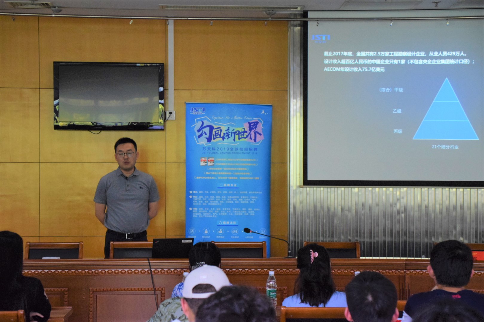 首先,陈娟副书记对苏交科集团股份有限公司作了简单而全面的介绍。同学们热烈欢迎郭涛副总经理作就业指导讲座。郭副总首先给同学们深刻分析了当前的就业形势,借助行业大数据分析,诸如工程勘察设计企业范围界定、企业数量变化、细分行业分布情况和营业收入的变化情况等,得出交通行业发展迅速、大有可为的结论。
