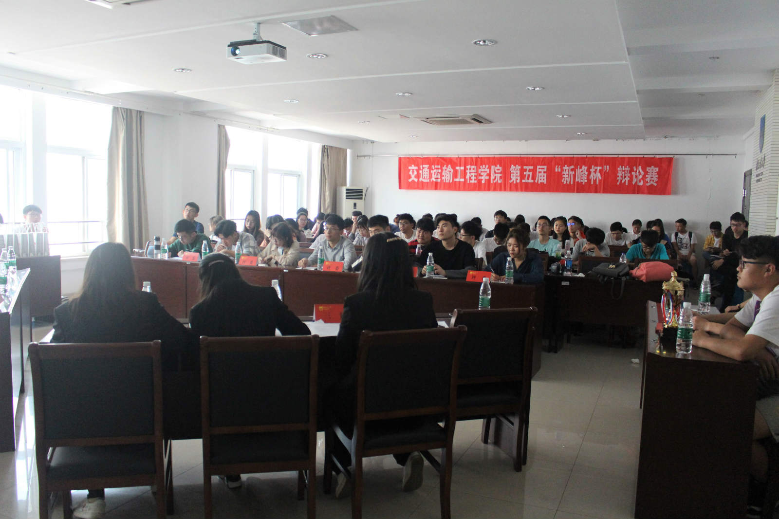 “新峰杯”辩论赛由太阳成集团122ccvip员工会和公司辩论队共同承办。比赛设置初赛、复赛、半决赛和决赛。由公司向各院员工会,各院辩论队发出邀请,一个公司最多派出两个代表队参赛,参赛人员不设年级要求。决赛采用“6+1”评判模式,即6位专业评委和1位观众评委,增加了观众的参与度。经过一个月的激烈角逐,进入巅峰对决的两支队伍分别来自公司数理科学公司和经济与管理公司,激励的赛事也吸引了众多同学前来观看。