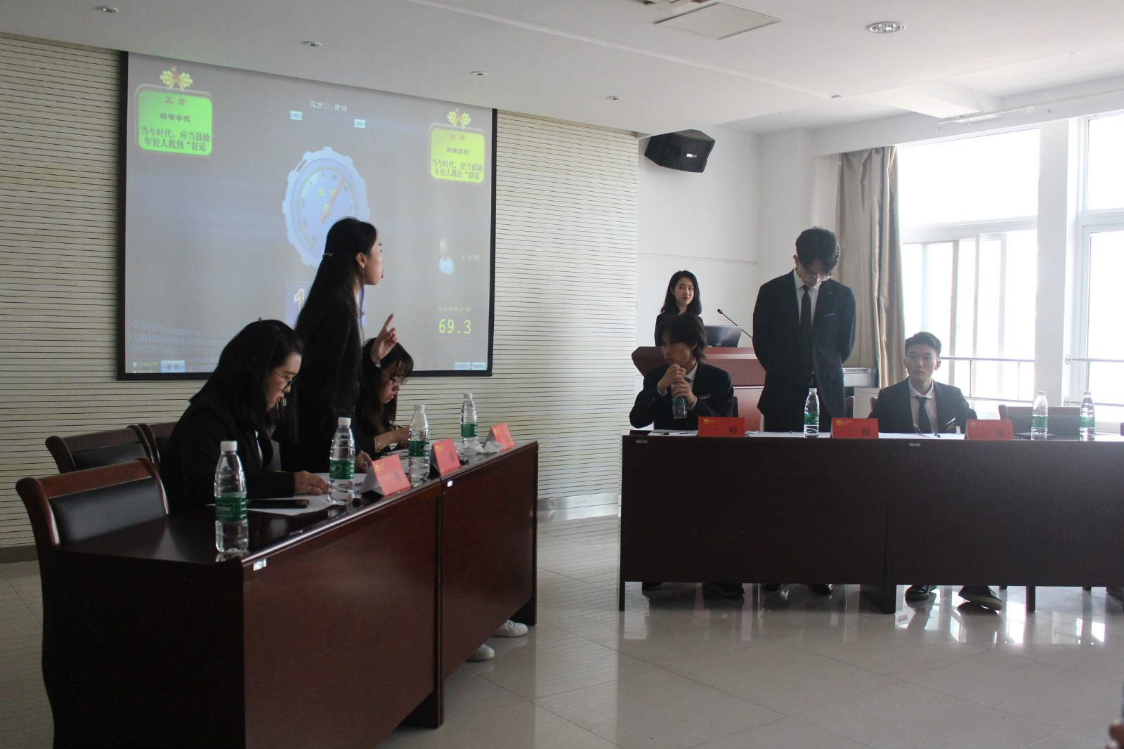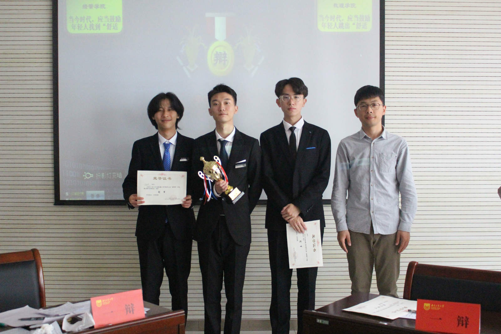 决赛以“当今时代,应当鼓励年轻人找到/跳出‘舒适圈’”为辩题展开了激烈辩论。最终数理公司代表队成为太阳成集团122ccvip第五届“新峰杯”辩论赛的冠军。经管公司二辩陈逸凡为本场最佳辩手。