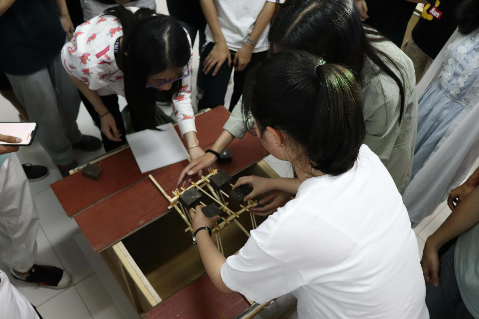 在主持人简要说明了比赛要求和具体流程之后,选手们开始了时长为两个小时的筷子桥制作,制作完成后评委们依次为筷子桥进行外观打分。在给筷子桥称重之后,进行的是加载环节。最终,16组选手经过激烈的角逐,嵇祺、范琪颖、刘淑芳小组获得一等奖;李锦洋、华翔、高雅美小组;孔王浩、李惠成、邓茂江小组获得二等奖;彭荣豪、马生财、伍先树小组等三个小组获得三等奖。