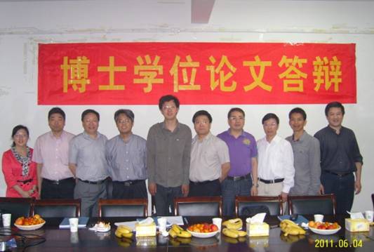 博士生陈磊(左5)与答辩组成员及导师合影留念