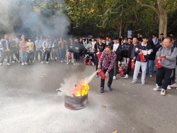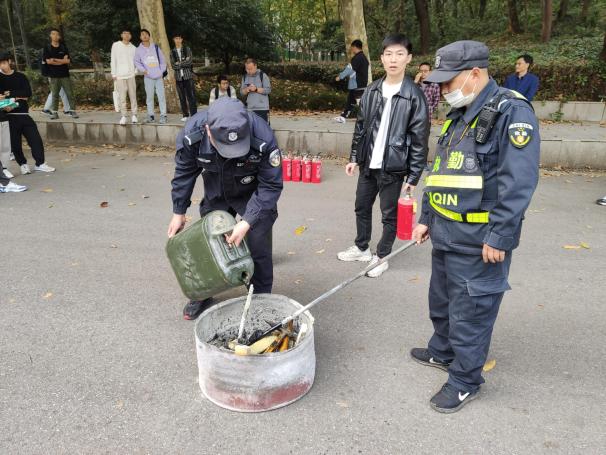 讲座结束后,在图书馆前广场进行消防实训。安保队员为大家演示灭火器的使用方法,并详细讲解了使用时的注意事项。演示结束后同学们逐个进行灭火器实操练习,掌握对消防器具的使用方法。