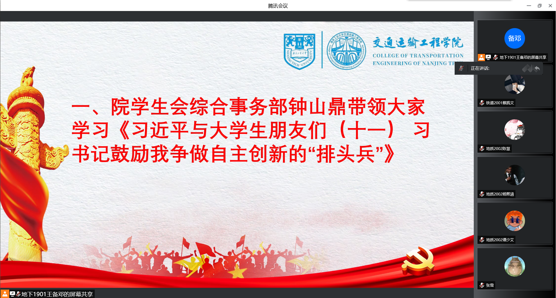 心理生活部申勇敢带领大家学习《习近平与老员工朋友们(三十九)——习主席勉励我们做民族团结进步事业的栋梁之材》,指出青年学子应砥砺意志品质,为实现中华民族伟大复兴的中国梦而努力奋斗!