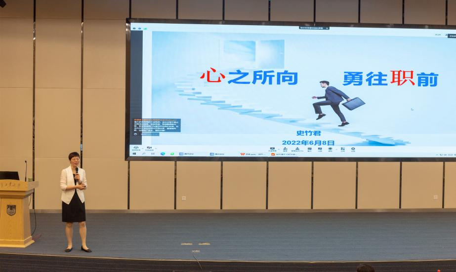 讲座中,史竹君员工用数据为大家解读了当前背景下的就业形势,并从心理学角度,详细讲述了职业生涯规划的脉络和职业心理素质和能力提升的技巧。她通过现场互动,启发同学们积极进行自我探索,并思考个人未来规划。
