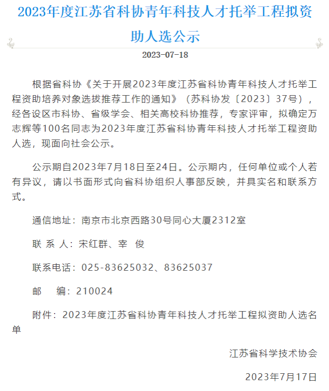 根据省科协《关于开展2023年度江苏省科协青年科技人才托举工程资助培养对象选拔推荐工作的通知》(苏科协发〔2023〕37号),经过省级学会推荐、省科协组织专家评审、省科协党组审议通过、网上公示等程序,公司青年教师万志辉副教授入选2023年度江苏省青年科技人才托举工程资助培养对象。“江苏省科协青年科技人才托举工程”是省科协贯彻落实《江苏省科协系统深化改革实施方案》,探索服务创新驱动战略,拓展培养举荐青年科技人才渠道,扶持有学术技术优势、有发展潜力的优秀青年科技人才的资助工程。