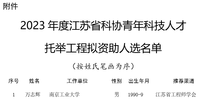 公司青年教师万志辉副教授入选江苏省科协青年科技人才托举工程资助培养对象