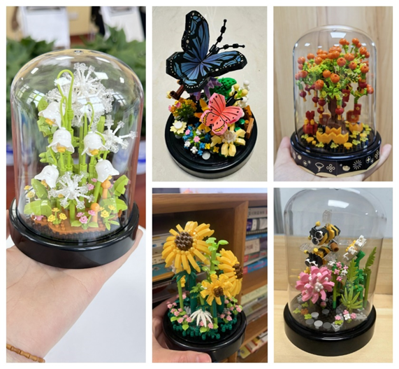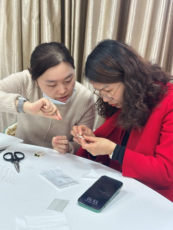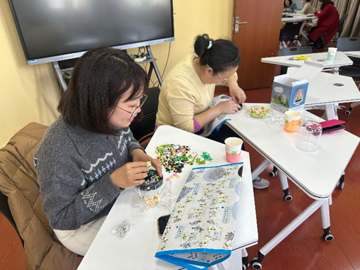 手工制作活动中,女教工们分为两组制作了珍珠手工胸针和积木花束。胸针组的老师们聚精会神、认真专注地将珍珠、水晶等装饰物镶嵌于胸针上,按照自己心仪搭配,制作成精致独特的胸针佩戴在胸前,彼此欣赏,笑语晏晏。积木花束组的老师们细心耐心地对照图纸,用灵巧的双手将琐碎的零件一步步拼接组装,一朵朵永不凋谢的积木花在大家手中尽情绽放。