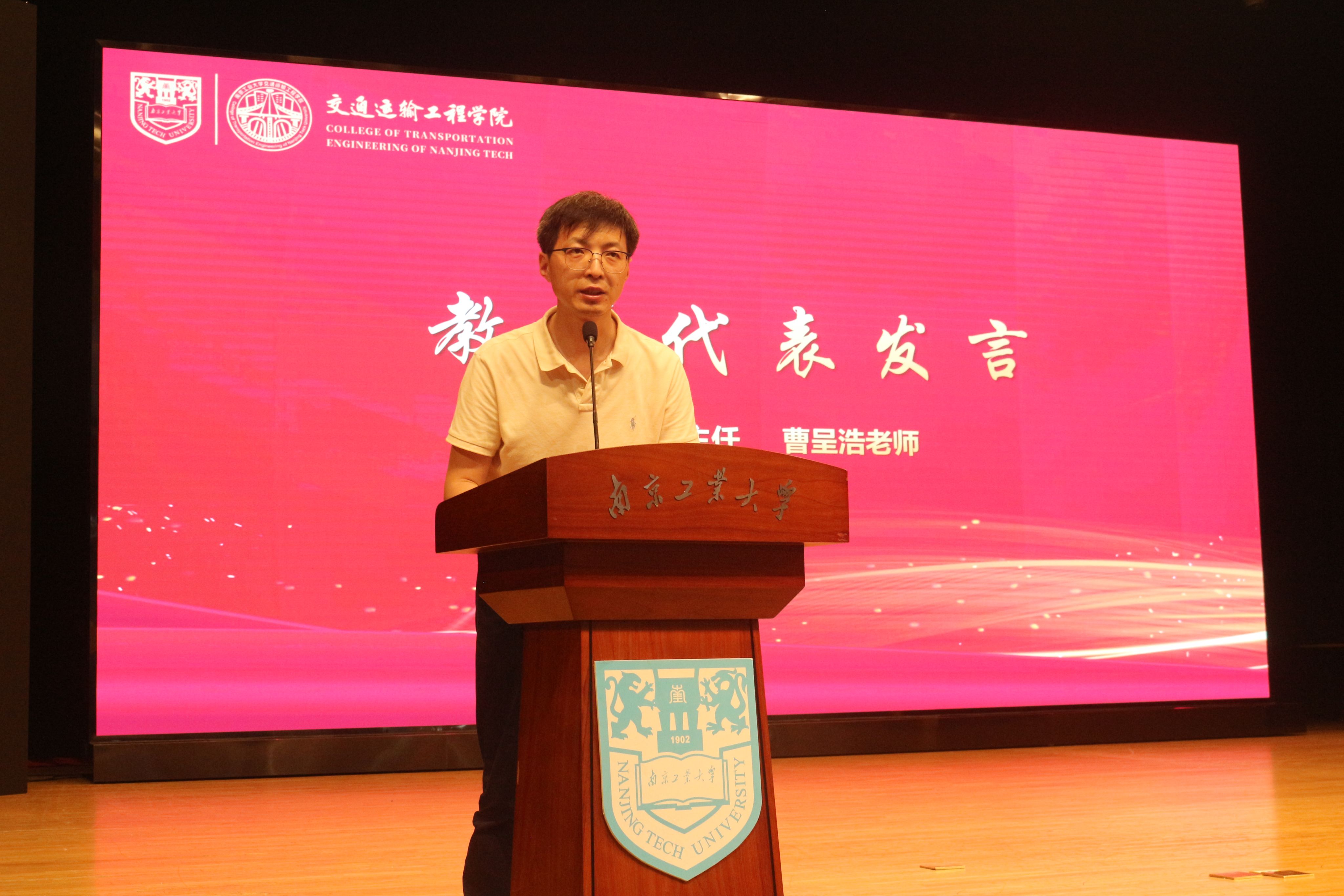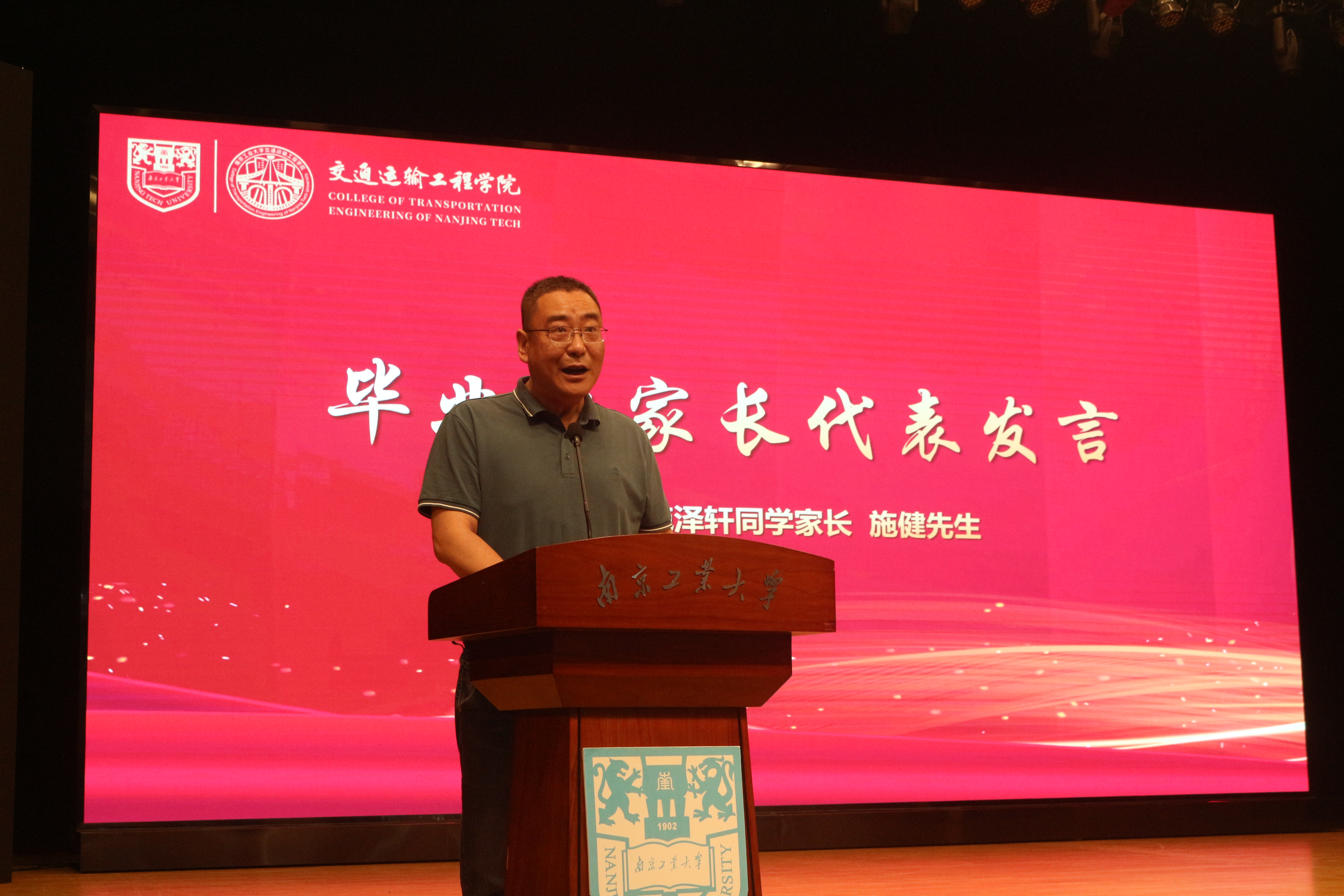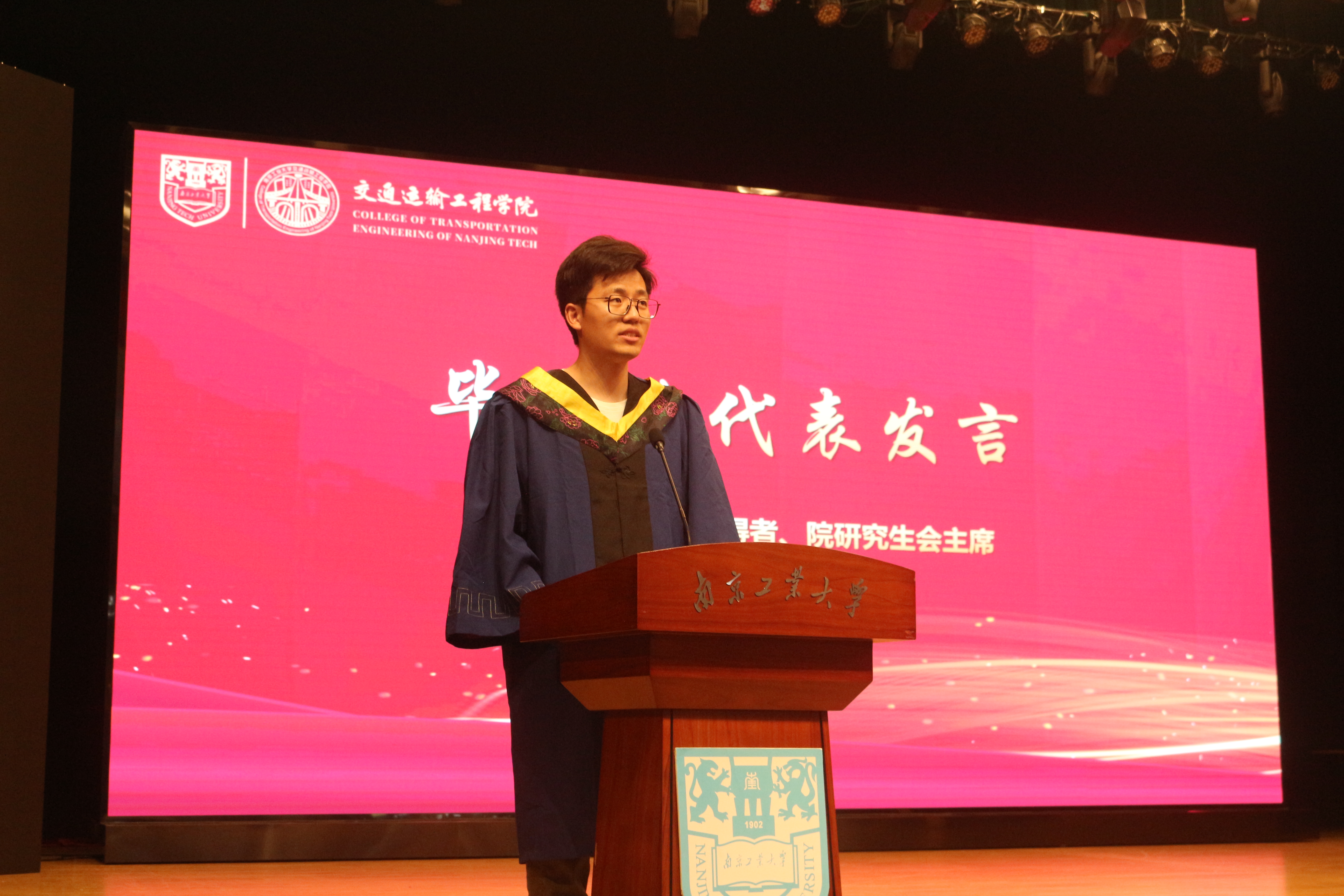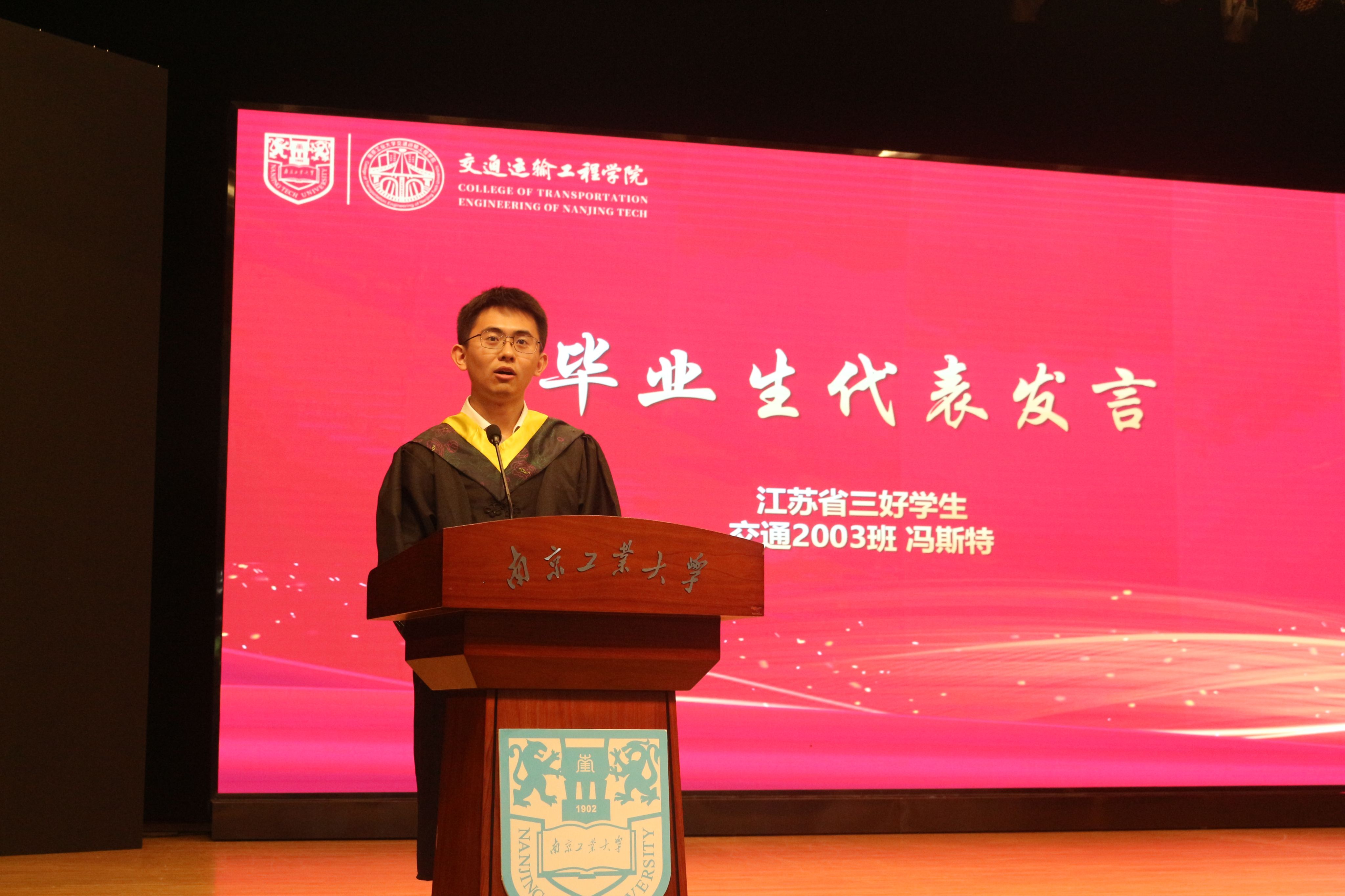 颂情谊,惜别离。毕业生代表交通2003班冯斯特追忆四年奋斗时光,以“莫愁前路无知己,天下谁人不识君”慰藉和激励即将远行的同学们。交研21级储城鑫借“长风破浪会有时,直挂云帆济沧海”祝愿同学们乘风破浪,创造辉煌。毕业生家长代表地下2002施泽轩父亲施健先生向公司公司的领导、老师对孩子们的辛勤付出表示感谢,并祝愿毕业生在人生的大舞台上秀出自己的风采。教师代表地质2001班主任曹呈浩老师号召交院学子要以“千淘万漉虽辛苦、吹尽狂沙始到金”的恒心顽强奋斗。