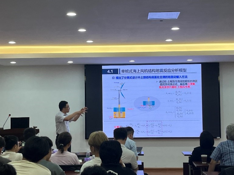 马超副教授以《城市地下结构抗震韧性评价方法研究》为题,围绕地下结构抗震韧性设计功能损伤函数与功能恢复函数的定量表达,地下结构各构件功能需求参数与阈值,地下结构地震动强度参数确定与易损性分析方法,以及地下结构抗震韧性评价案例分析等问题进行介绍。王丕光教授以《海洋工程结构抗震分析方法研究》为题,针对风浪流和地震作用下海洋工程结构与海床地基系统的耦合响应机理的科学问题,详细介绍了水体-结构-土体耦合系统地震反应的高效分析方法,地震作用下水-结构动力相互作用的附加质量简化分析方法,以及固定式海上风机一体化抗震分析方法及振动控制措施。师生代表们就结构震后功能的水准划分以及地震易损性分析中参数不确定性,数值模拟中附加质量方法的适用条件,涌浪和近岸波浪的作用机制等问题进行了深入交流。