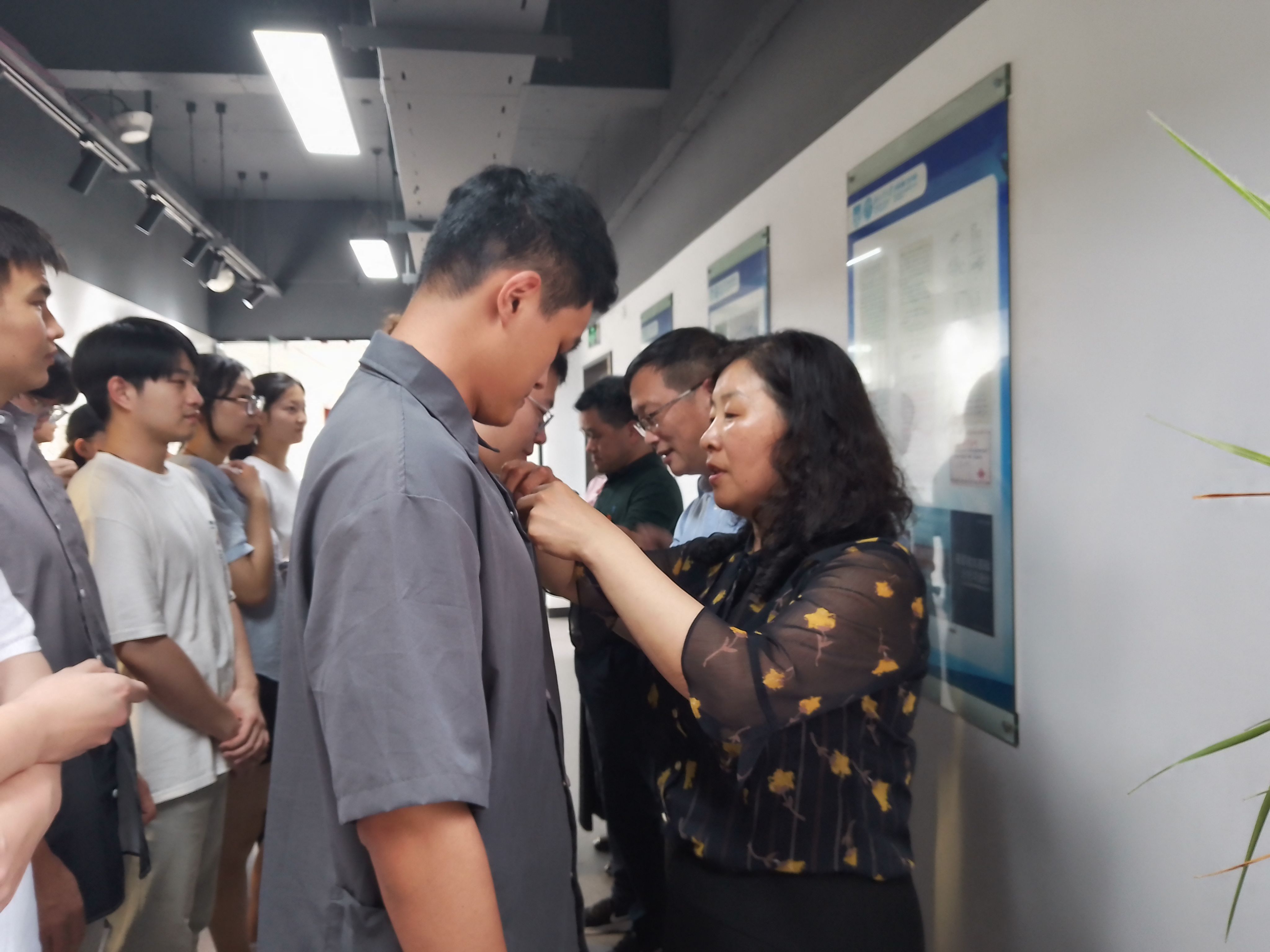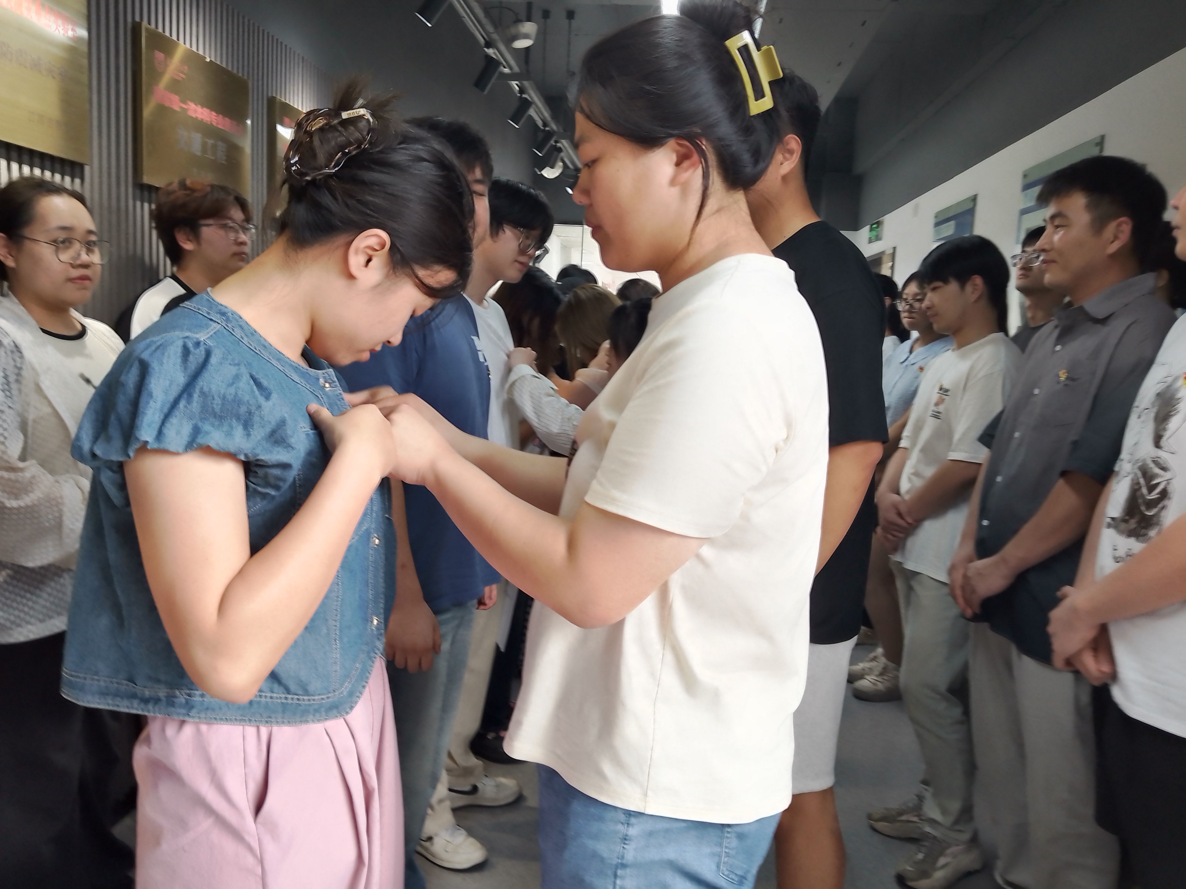 师生们来到宰金珉教授雕像前,向雕像鞠躬致敬。在场老师和支部书记们代表老党员给新党员们一一佩戴党徽,激励新党员党徽象征着党员身份、责任和担当,鞭策新党员自觉履行党员义务,听党话、感党恩、跟党走,全心全意为人民服务。