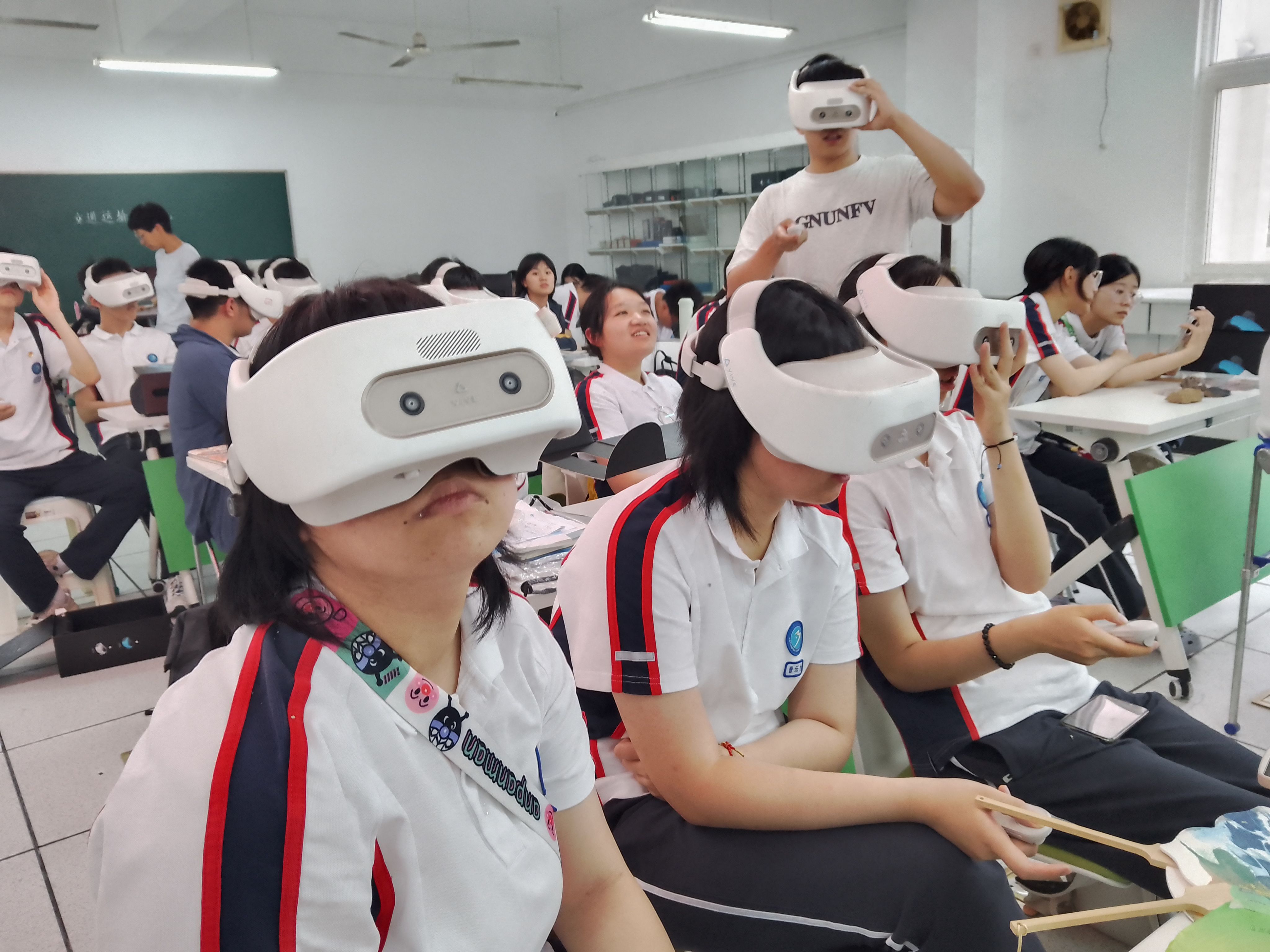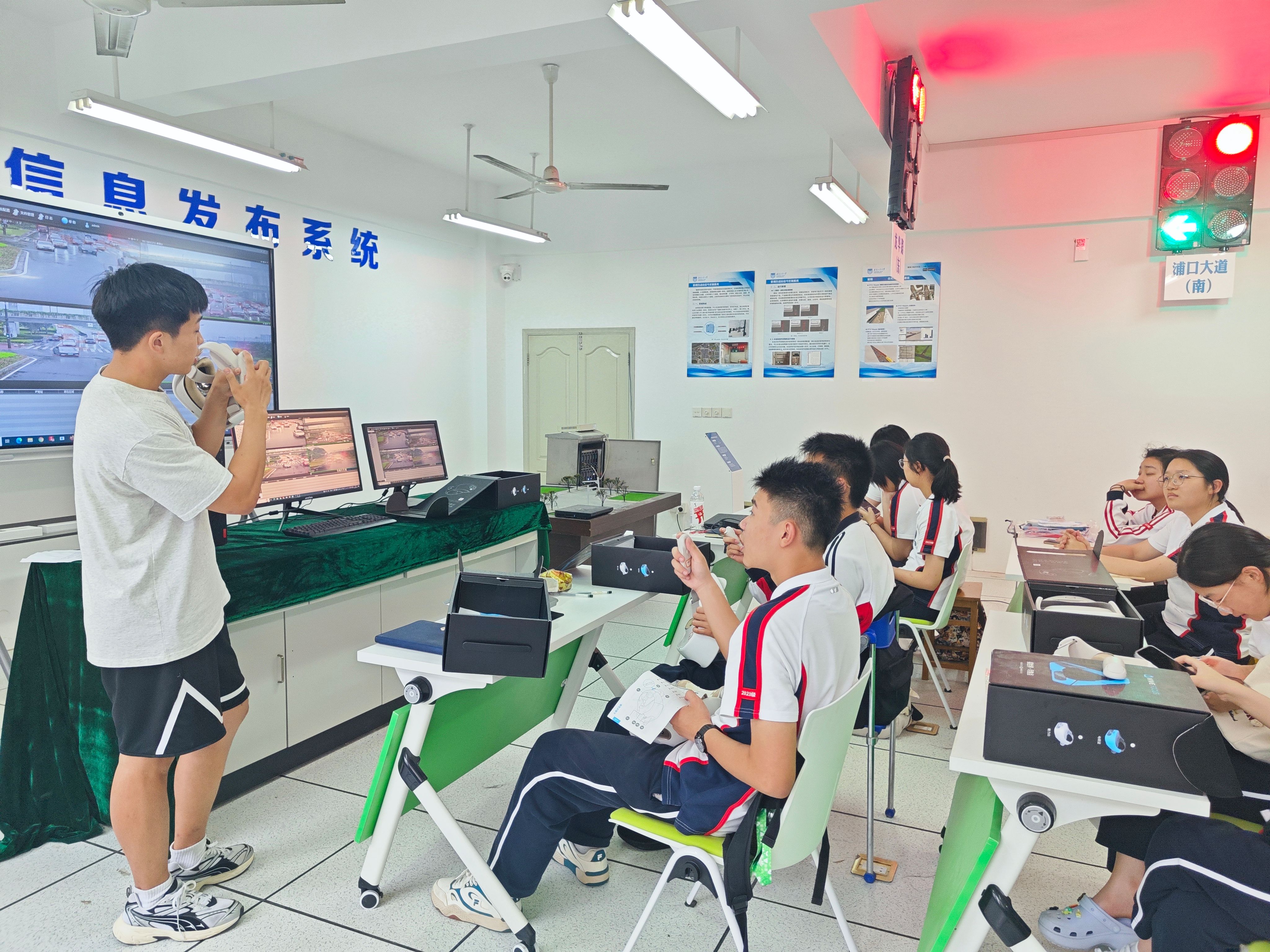 在虚拟仿真室,同学们先听取了雷视自适应信号控制系统的工作原理,感受用“透视眼”和“超远视”功能进行公司南门龙华交叉路口的实时信号数据的收集与分析,从而进行道路信号优化的智能交通功能。然后,在听取相关知识和使用方法后,带上VR眼镜,按照实验步骤,进行岩体工程仿真学习,仿佛穿越时空,身临其境来到一个个虚拟场景,探索科学奥秘。在模拟驾驶室,同学们近距离了解UC win/Road驾驶模拟软件,体验在虚拟的交通世界,驾驶者在不同天气、路况、环境下的驾驶感受及科研魅力。