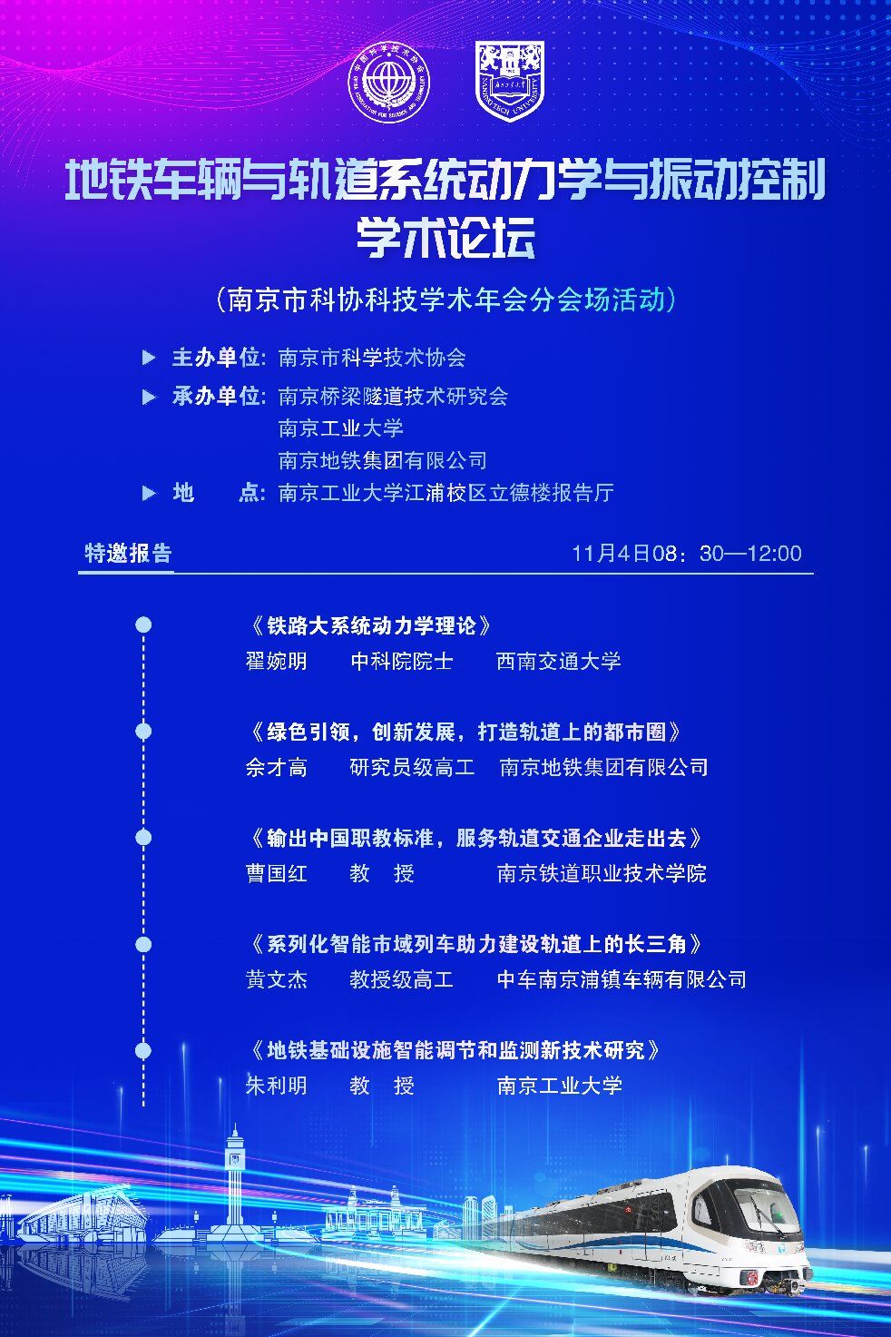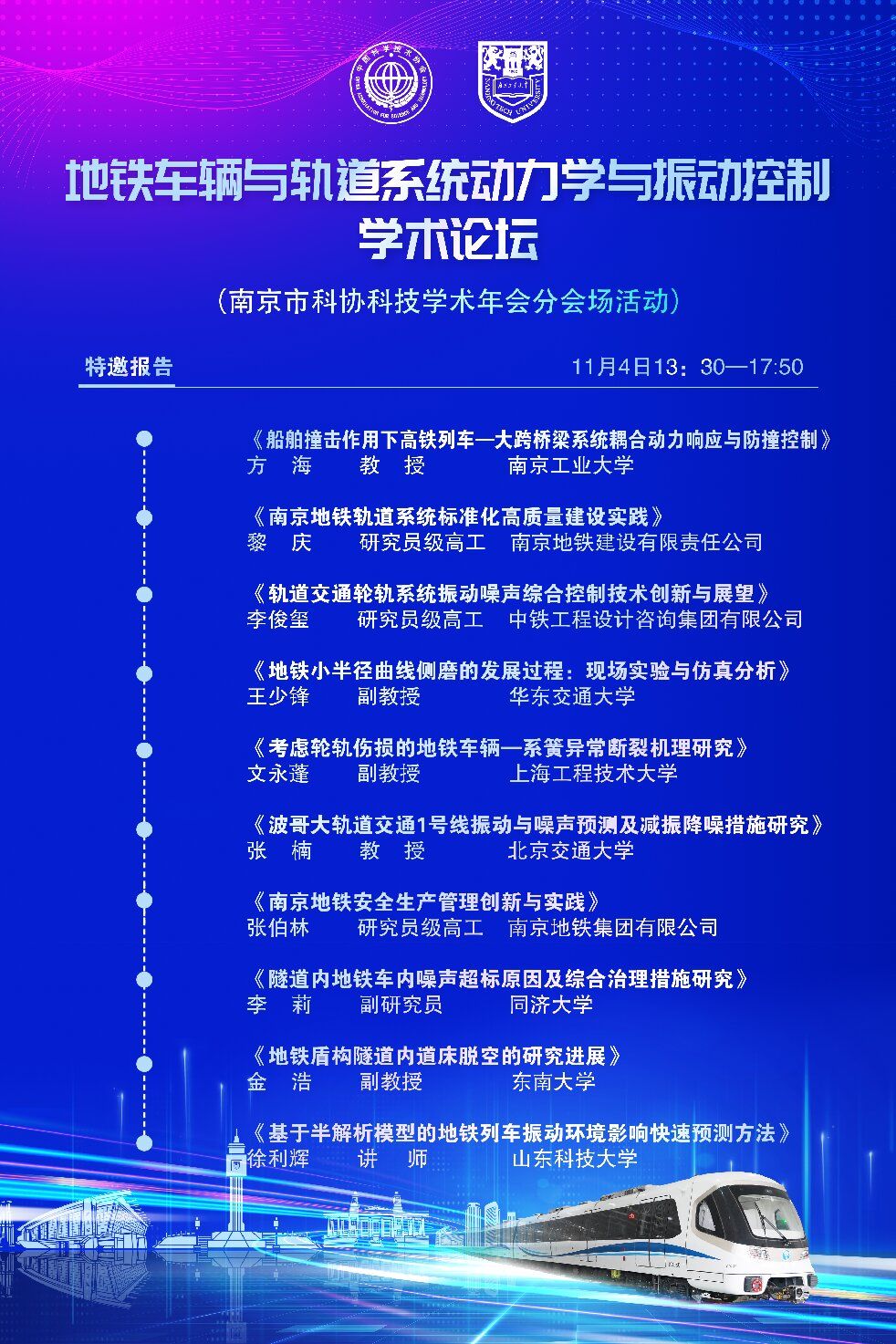 地铁车辆与轨道系统动力学与振动控制学术论坛拟定于2023年11月4日在江苏省南京市召开,会议作为南京市科协科技学术年会分会场活动,由南京市科协主办,南京桥梁隧道技术研究会、太阳成集团122ccvip、南京地铁集团有限公司联合承办,江苏省交通基础设施安全保障技术工程研究中心、中车南京浦镇车辆有限公司、南京铁道职业技术公司协办。本次会议将围绕地铁车辆与基础设施动力学领域学术前沿及关键技术问题进行研讨,旨在探讨地铁车辆与基础设施振动学科发展、交流研究成果和展望未来,增进领域内研究人员之间的学术交流与产学研合作,推动相关领域深入发展。