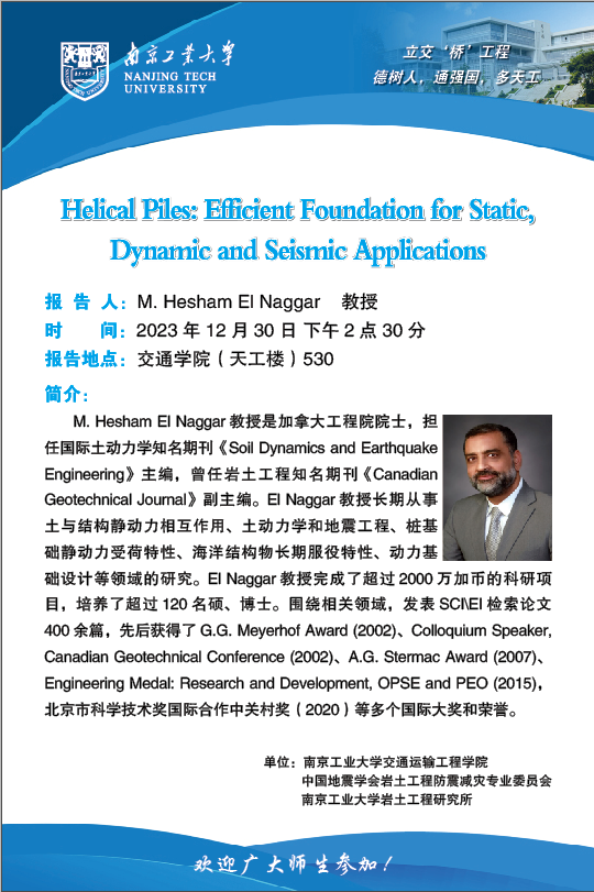 学术报告:Helical Piles: Efficient Foundation for Static, Dynamic and Seismic Applications