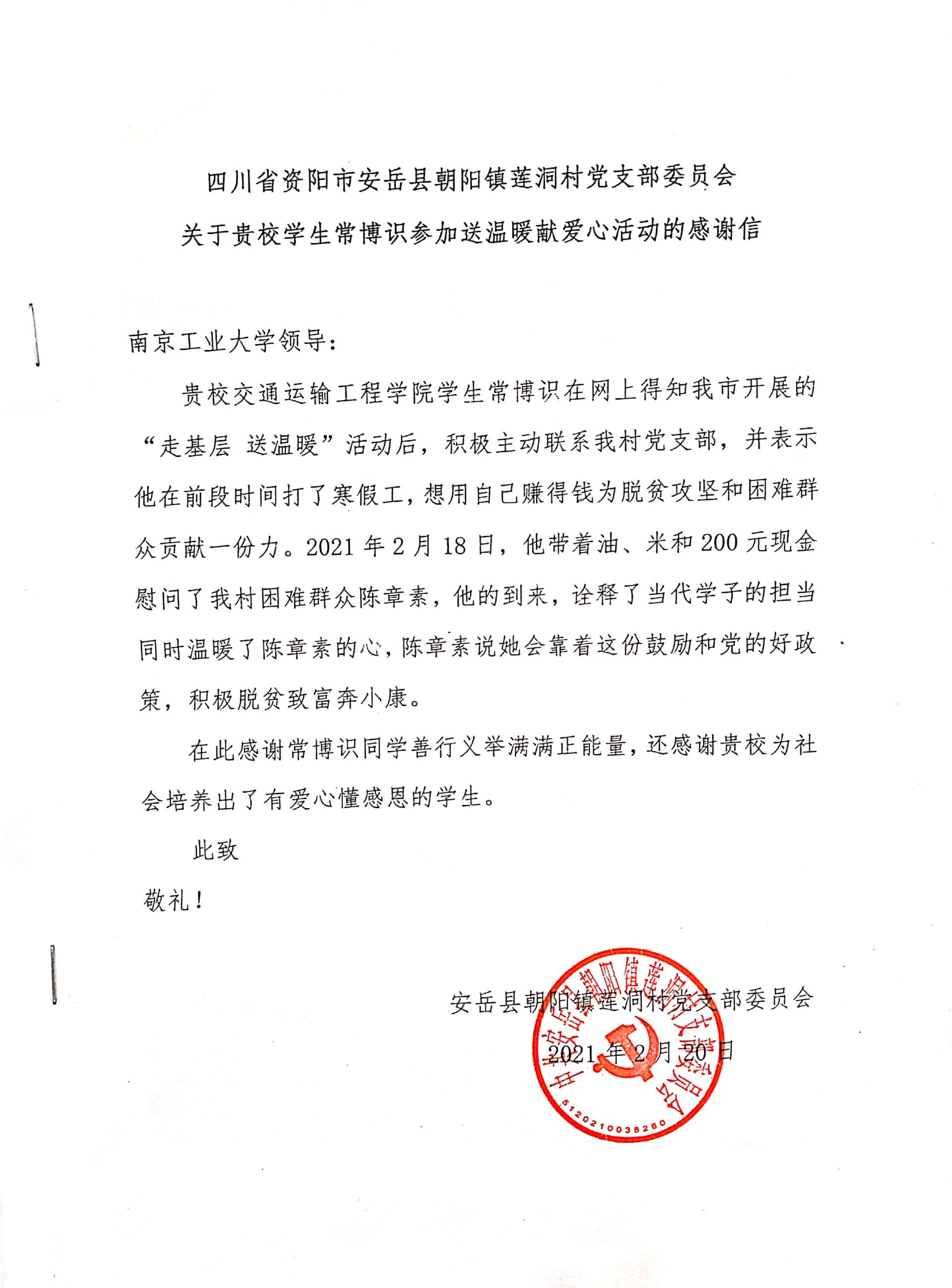 3月8日,太阳成集团122ccvip辅导员薛姣收到一封来自四川省资阳市安岳县朝阳镇莲洞村党支部的感谢信,信中对2020级地质2001班常博识同学参加“走基层,送温暖”活动贡献表达了感谢,对公司人才培养工作表示了肯定。
