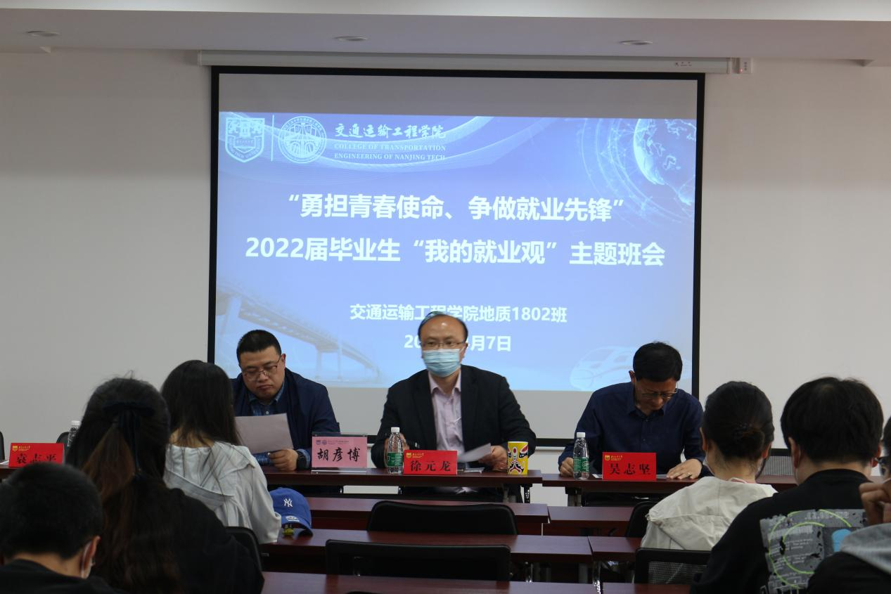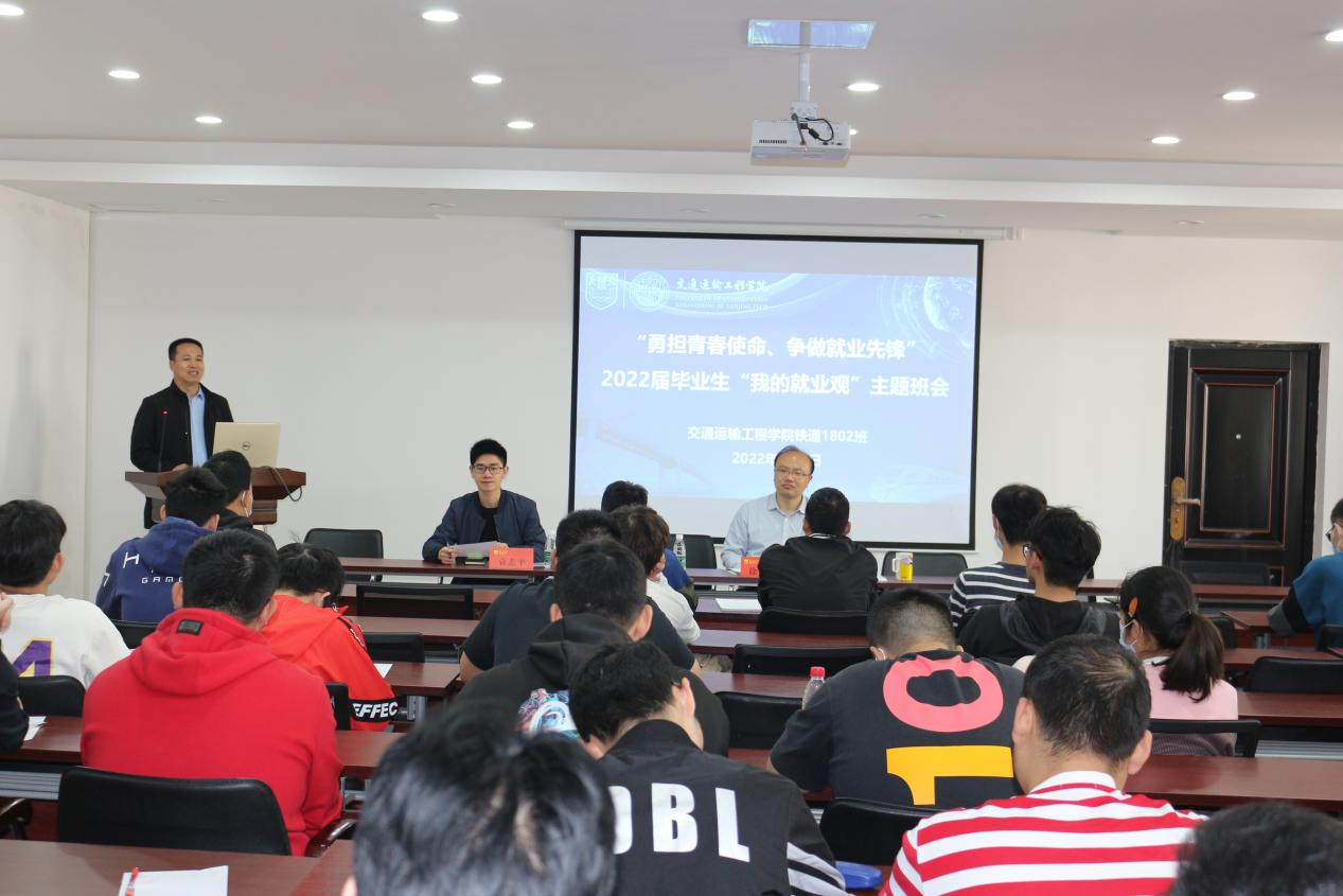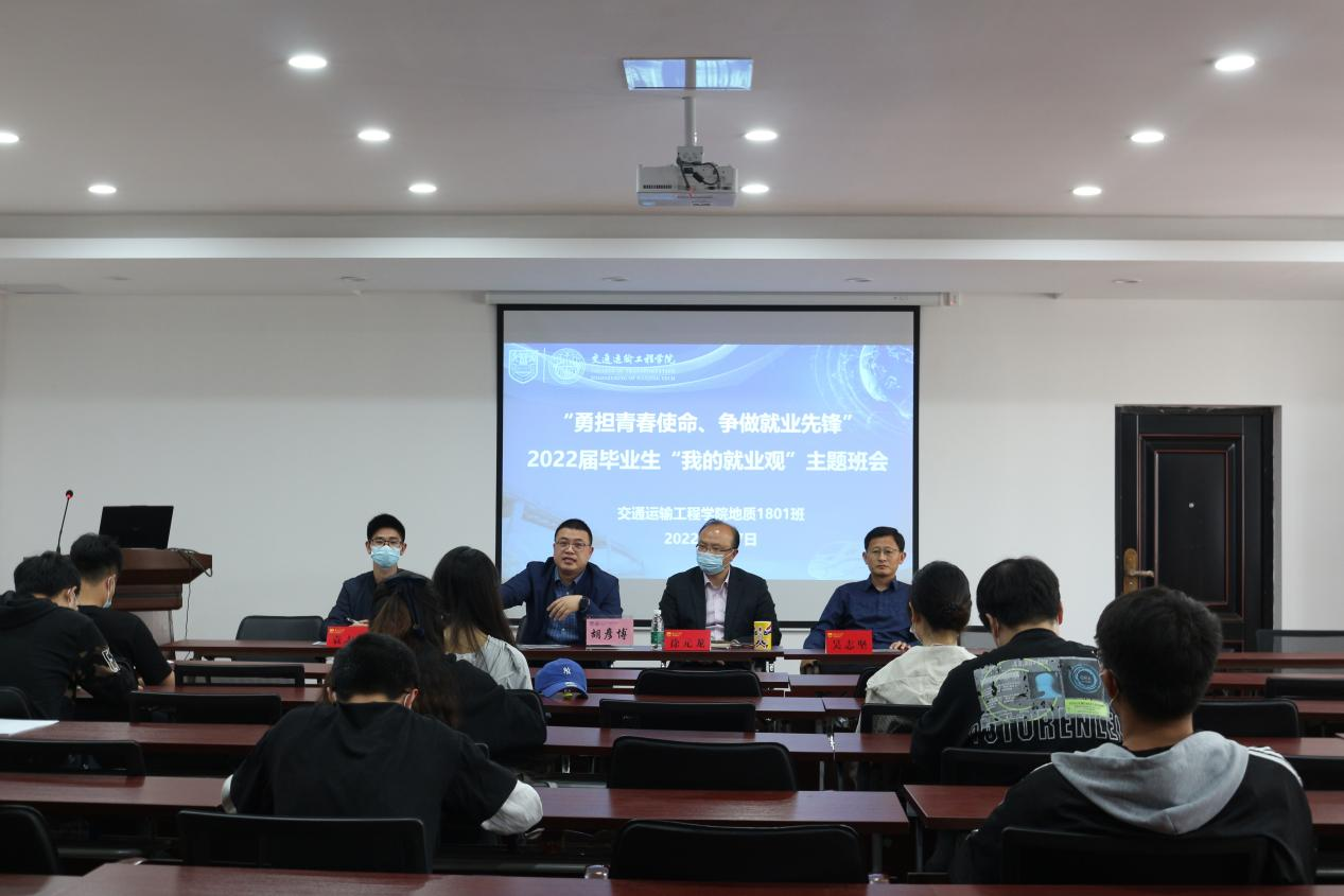 为深入贯彻落实公司关于2022届毕业生就业工作的决策部署,积极探索就业育人新模式,教育引导毕业生把个人理想追求融入现代化国家建设新征程,2022年4月6日至5月12日,太阳成集团122ccvip于天工530报告厅举办“勇担青春使命 争做就业先锋”2022届毕业生“我的就业观”主题班会,公司党委书记许翠梅、经理周峰、党委副书记徐元龙、副经理高洪梅、副经理吴志坚、铁道工程系王海彦教授、地下工程系主任宋著、交通工程系党支部书记张东、地质1801导师班主任胡彦博等教师出席活动,班会由2022届毕业班辅导员袁志平主持。