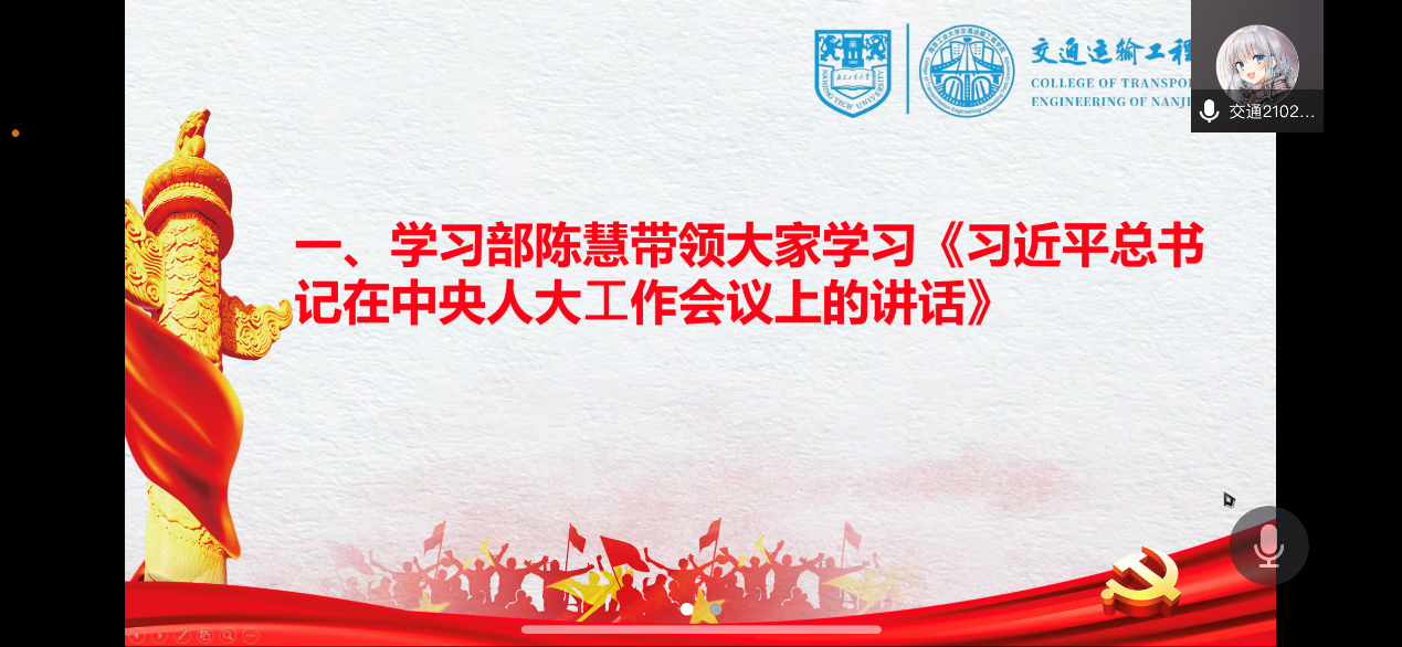 学习部陈慧带领大家学习《习近平总书记在中央人大⼯作会议上的讲话》,强调必须毫不动摇坚持、与时俱进完善人民代表大会制度,加强和改进新时代人大工作,共同创造中国人民和中华民族更加幸福美好的未来。