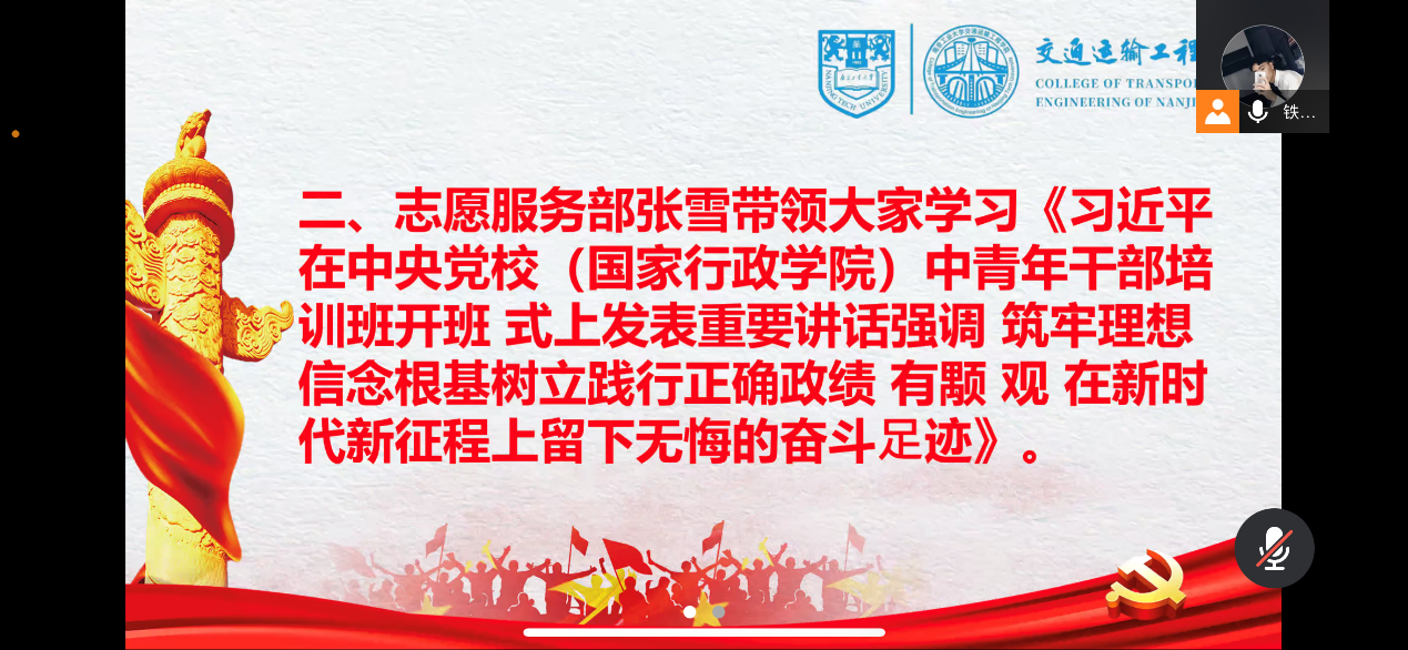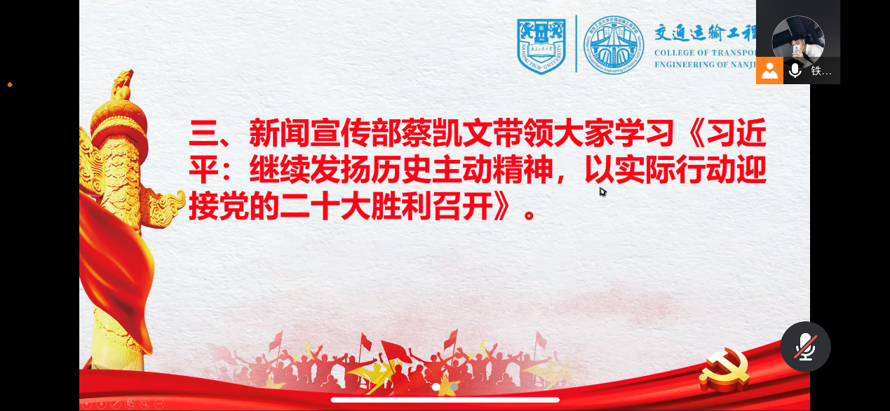 新闻宣传部蔡凯文带领大家学习《习近平:继续发扬历史主动精神,以实际行动迎接党的二十大胜利召开》。强调要全⾯贯彻党的⼗九⼤和⼗九届历次全会精神,增强“四个意识”、坚定“四个⾃信”、做到“两个维护”,对“国之⼤者”领悟到位,始终在思想上政治上⾏动上同党中央保持⾼度⼀致。