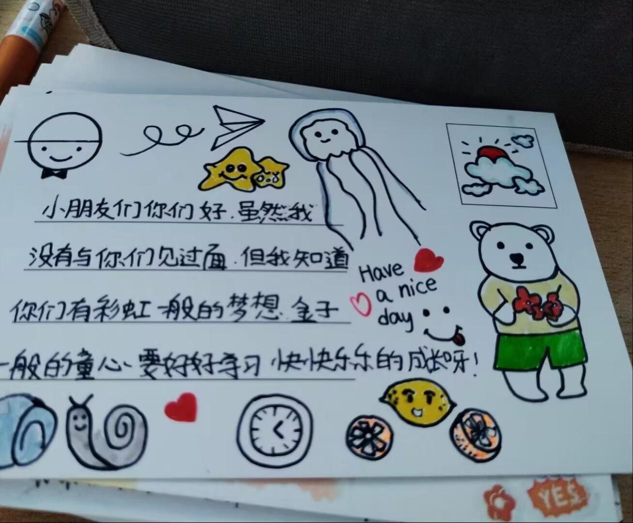 值得庆幸的是本次活动吸引了全校同学的广泛参与,同学们争相在明信片上写下自己对留守儿童的祝福。在创作过程中,志愿者联系公司曾经支教的研究生了解当地实情和支教内容,并由针对性创作了贺卡形式,不仅有文字,还有诗画。老员工们鼓励山区儿童有机会走出大山,去大城市看更繁华的世界,拥有更丰富的阅历,对自己未来发展之路有初步设想。