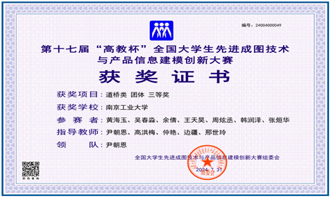 公司代表队通过省预选赛选拔参加国赛道桥类竞赛,获道桥类团体三等奖1项(黄海玉、吴春淼、余倩、王天昊、周炫丞、韩润泽、张烜华),黄海玉同学获道桥类成图赛道二等奖,吴春淼、余倩、王天昊同学获道桥类成图赛道三等奖。自2019年公司首次参加全国成图大赛以来,整体成绩持续进步,这也是公司课程教学改革和创新人才培养模式成果的体现。图学类教学团队总结出丰富的以赛促教的教学经验,显著提升了员工的工程图学素质,为行业培养了一批具有创新能力的优秀人才,获得用人单位的好评。