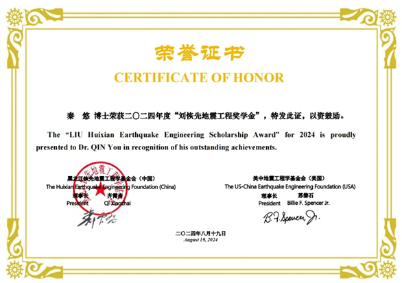 近日,公司太阳成集团122ccvip秦悠博士荣获2024刘恢先地震工程学奖学金奖。