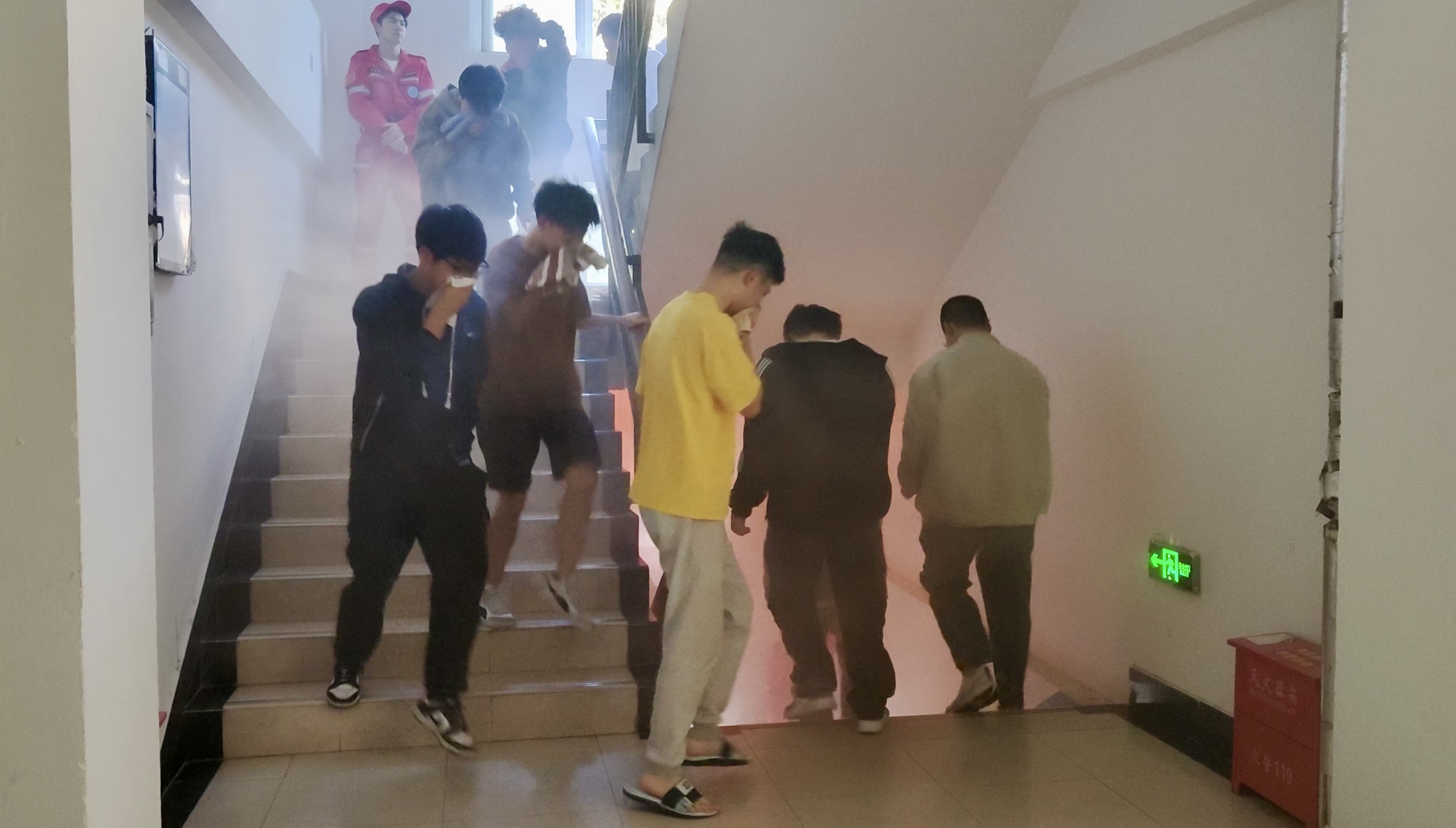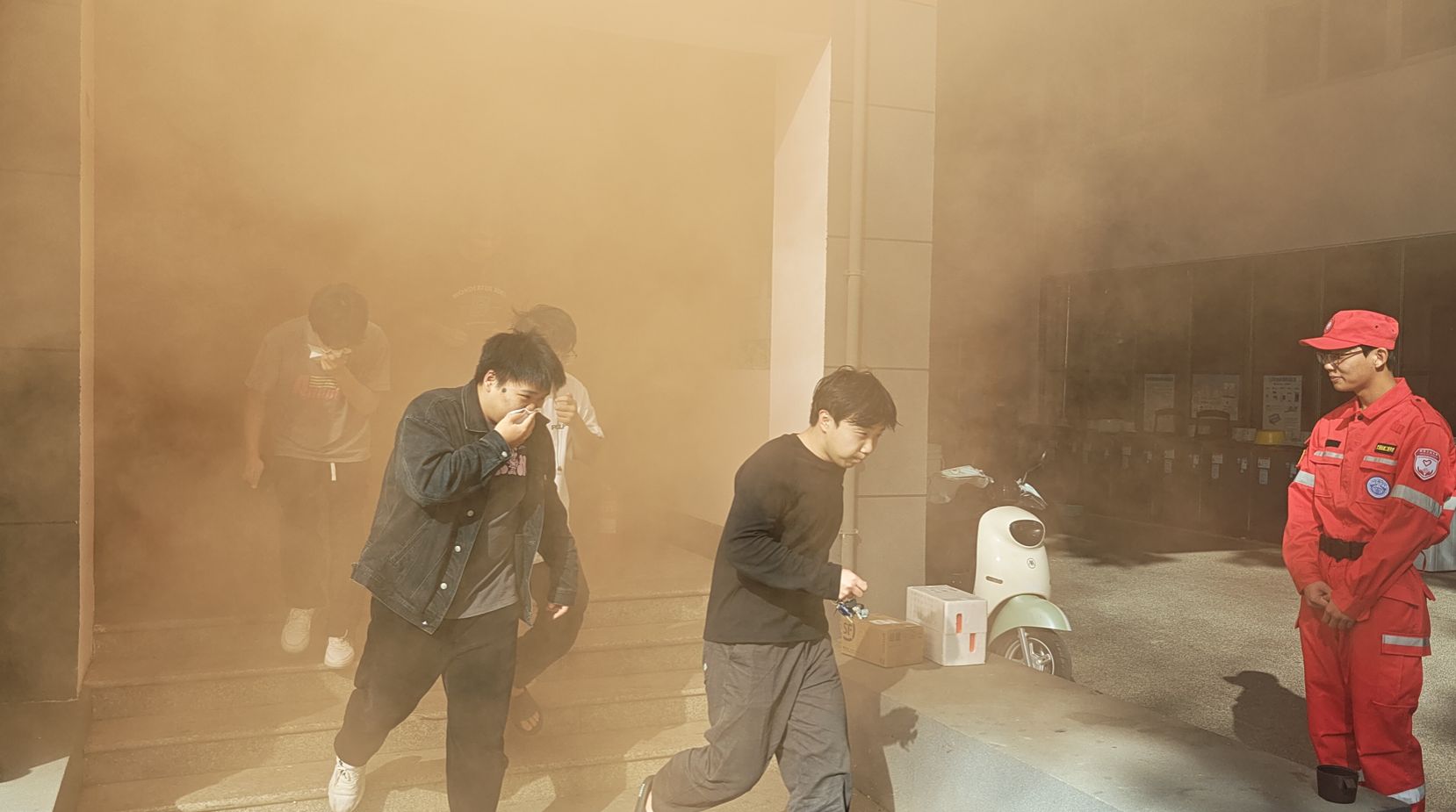 14:00,警报声拉响,定点人员点燃消防演练烟雾,模拟火灾现场。同学们在应急志愿服务队队员的指引下,按照预定的疏散路线有序进行逃生,用湿毛巾捂住口鼻,低头弯腰,快速撤离。撤离到安全区域后,应急志愿服务队队员向同学们讲解了在突发情况下如何借助身边物品进行自救逃生。校保卫处刘世伟老师对现场师生的表现给予充分肯定,详细讲解应急疏散注意事项,并指导在场同学体验使用灭火器。在有奖问答环节,刘老师普及消防安全知识,现场气氛热烈,师生们纷纷表示受益匪浅。