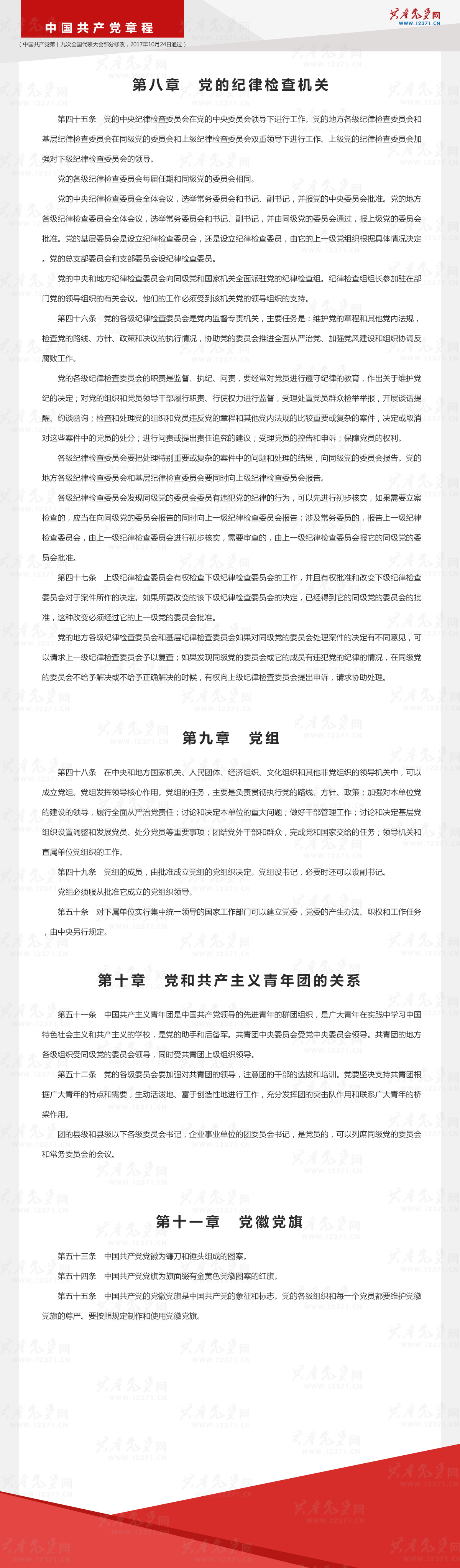 中国共产党章程|第八、九、十、十一章 党的纪律检查机关、党组、党和共产主义青年团的关系、党徽党旗