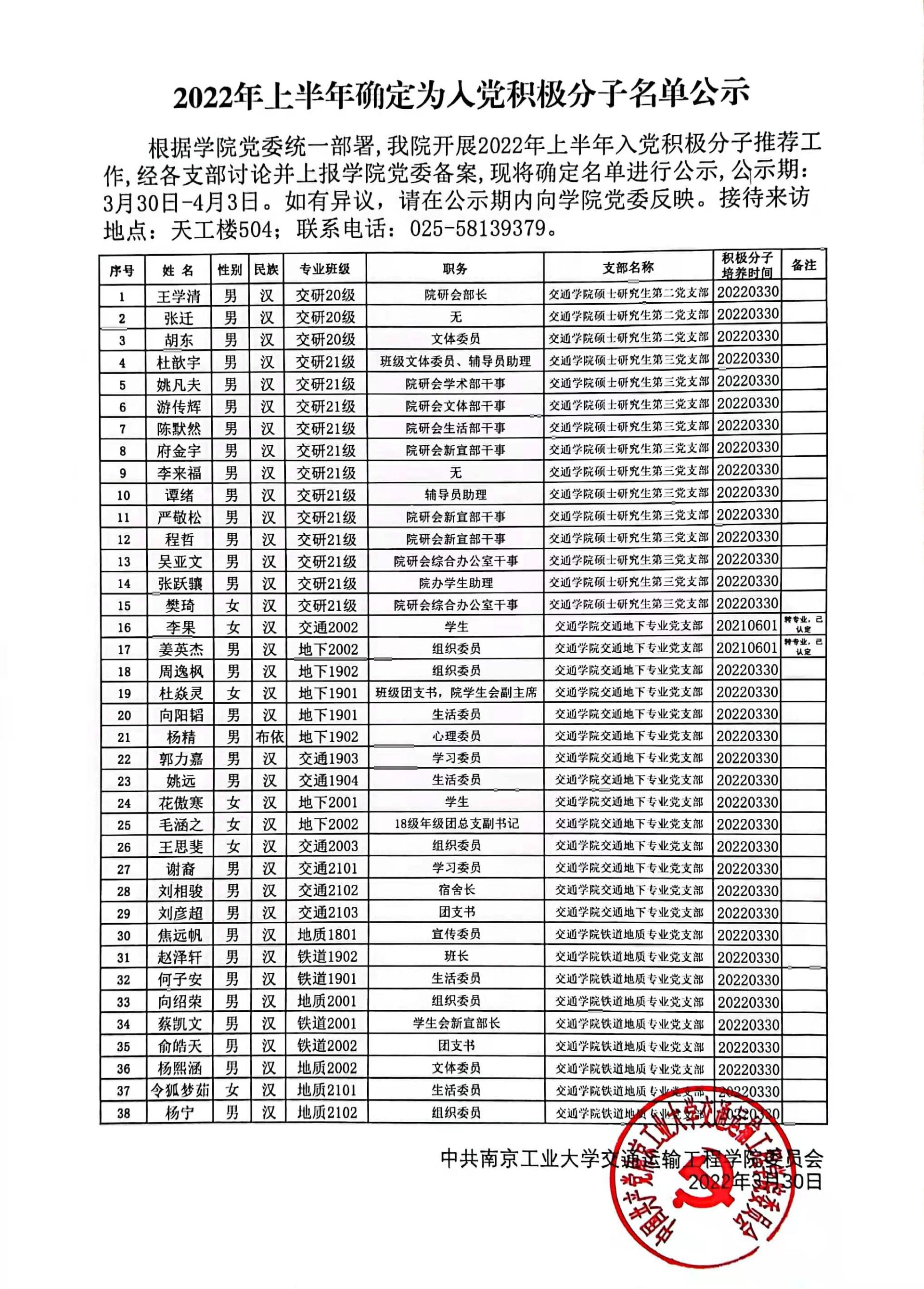 2022年上半年确定为入党积极分子名单公示