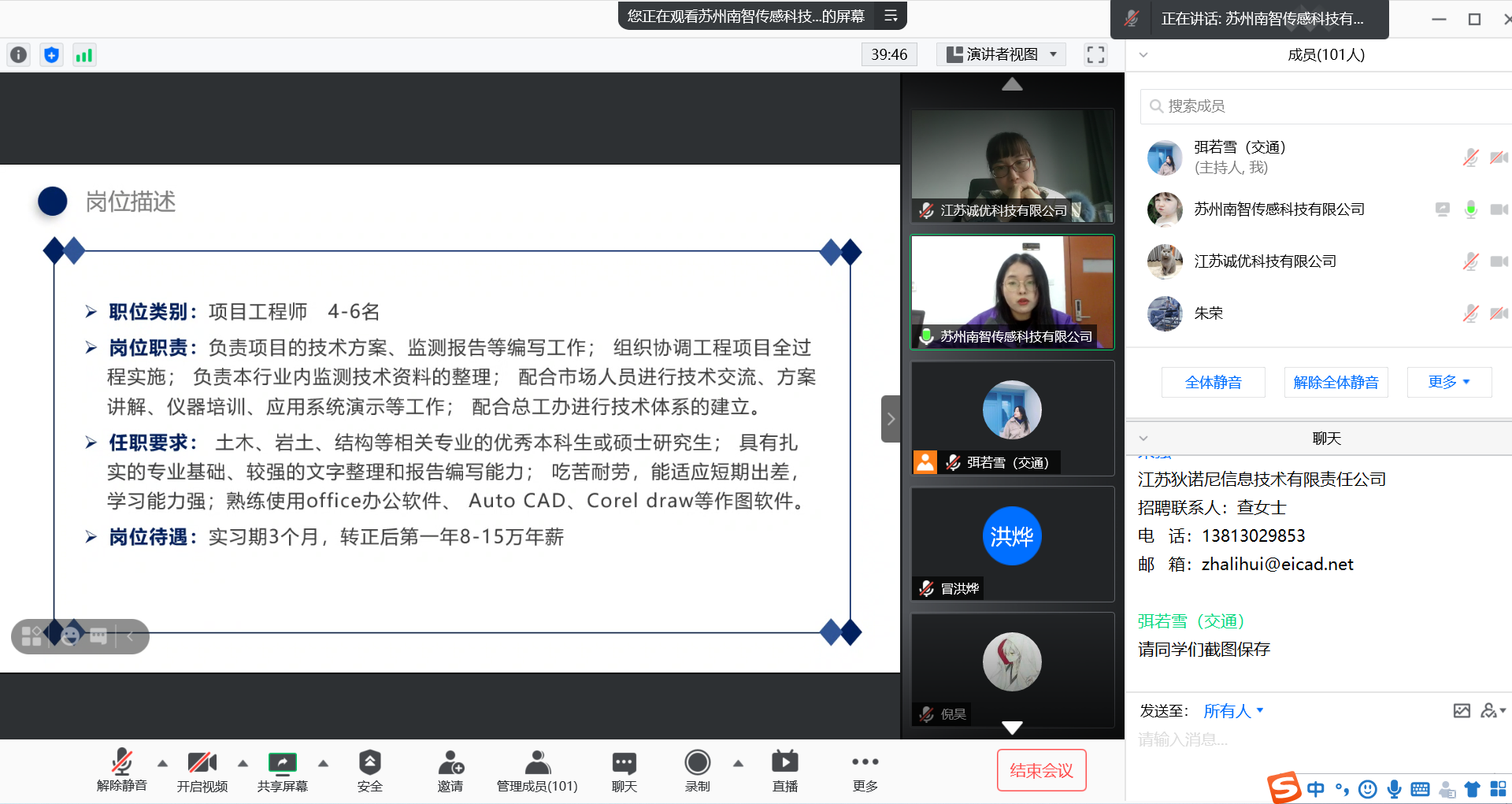 为有效落实全员抓就业新举措,本次邀请到企业都是来自公司各专业系主任或教授引荐。毕业班辅导员弭若雪首先对参加活动的企业表示欢迎,通过直播向广大用人单位介绍公司学科特色和国家级及省级一流专业建设点情况,并介绍了公司2021届毕业生就业动态,鼓励员工积极通过线上线下多种渠道获取就业信息,抓住3月份招聘高峰窗口期去落实适合自己的岗位,号召老员工们拥抱变化,先就业、再择业。各家企业就本单位最新发展成果和岗位需求进行了介绍,对企业的公司简介、薪酬福利和简历投递等内容进行了详细介绍。