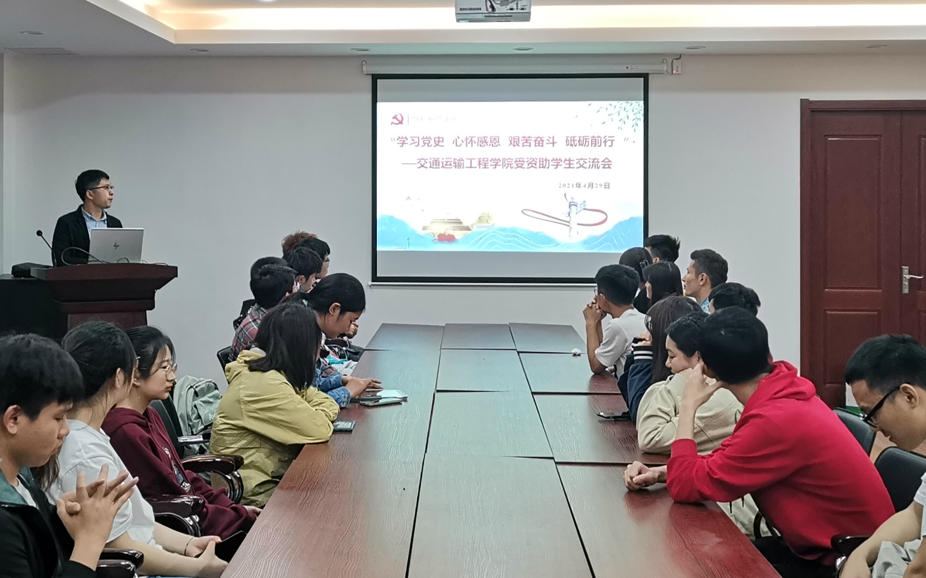 座谈会上,蔡老师结合习近平总书记在党史学习教育动员大会上的重要讲话精神,引导同学们学党史、感党恩、跟党走,积极参加党史学习教育,努力做到学史明理、学史增信、学史崇德、学史力行。蔡老师结合同学们受到资助后的发展情况及公司资助育人工作向同学们宣传相关资助政策,鼓励同学们建立明确发展目标,坚定信心和定力,努力提升学习力,做好职业生涯规划。优秀毕业生代表顾莹莹和刘大帅分别从自身受资助情况和大学学习生涯方面向同学们分享了自己的奋斗拼搏故事。座谈会后在场同学和两位优秀学长进行了深入交流,学长亲切的话语鼓舞了同学们“艰苦奋斗砥砺前行”的决心。