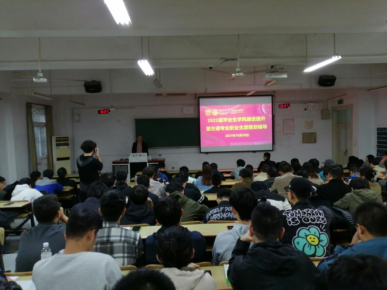 徐元龙老师向同学们分析了2022届本科生就业形势,重点分析了考研以及就业、春招和秋招的关系,深入解读了应届生身份,提醒毕业生在就业出路选择上,要及时根据自己的兴趣能力等各方面情况,积极探索职业规划,锁定职业目标迈步前行。许经理针对交通土建类职业发展路径为毕业生讲授入职后的职业规划发展路径,勉励同学们学会自我提升、终身学习及勇于改变,不断在工作中砥砺前行。