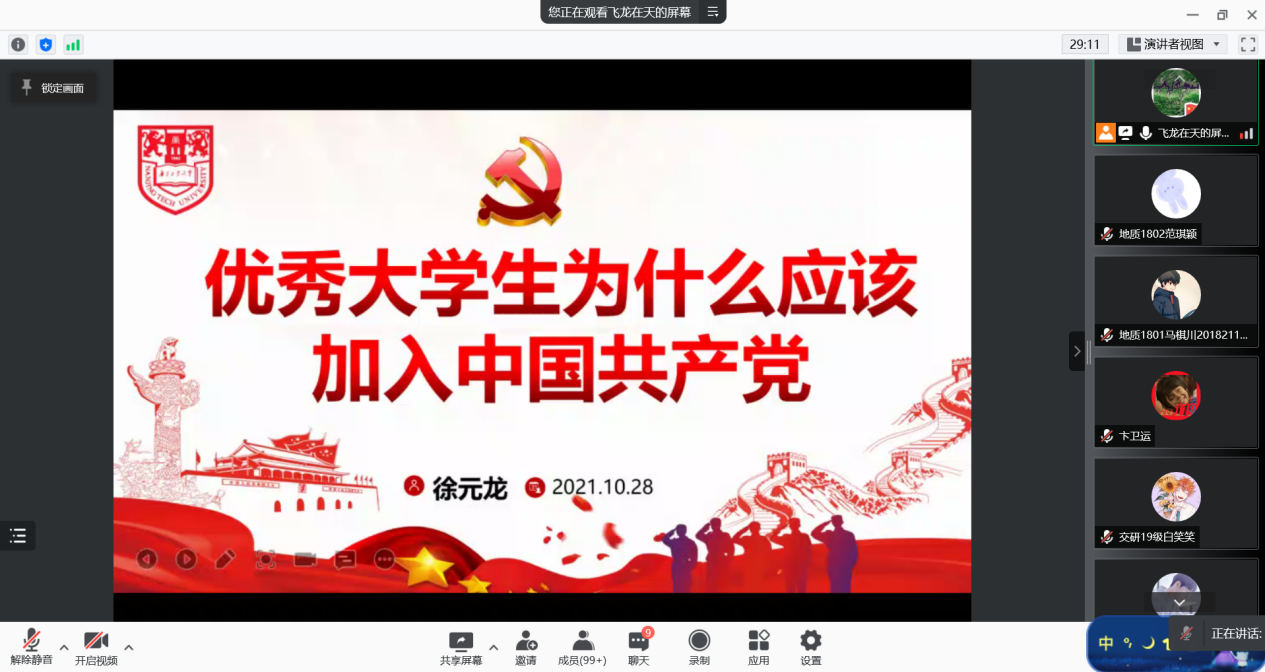 徐元龙老师从“优秀老员工为什么要加入中国共产党”话题引入,声情并茂地介绍了中国共产党带领全国各族人民努力拼搏取得的一个又一个伟大成就,引导员工坚定“四个自信”。作为一名老员工入党积极分子,一定要将个人梦想融入到中国梦中不断奋斗努力。徐老师结合优秀学长的事例,教育同学们要端正入党动机,在党组织在关怀和培养下越来越优秀,不断提升为人民服务的成效。在讲座中徐老师从入党各个考察环节强调了党员发展标准,要求同学们以百年党史学习为契机,认真学习党的基本理论和基本知识,不断深入群众,了解群众,践行好党的宗旨。