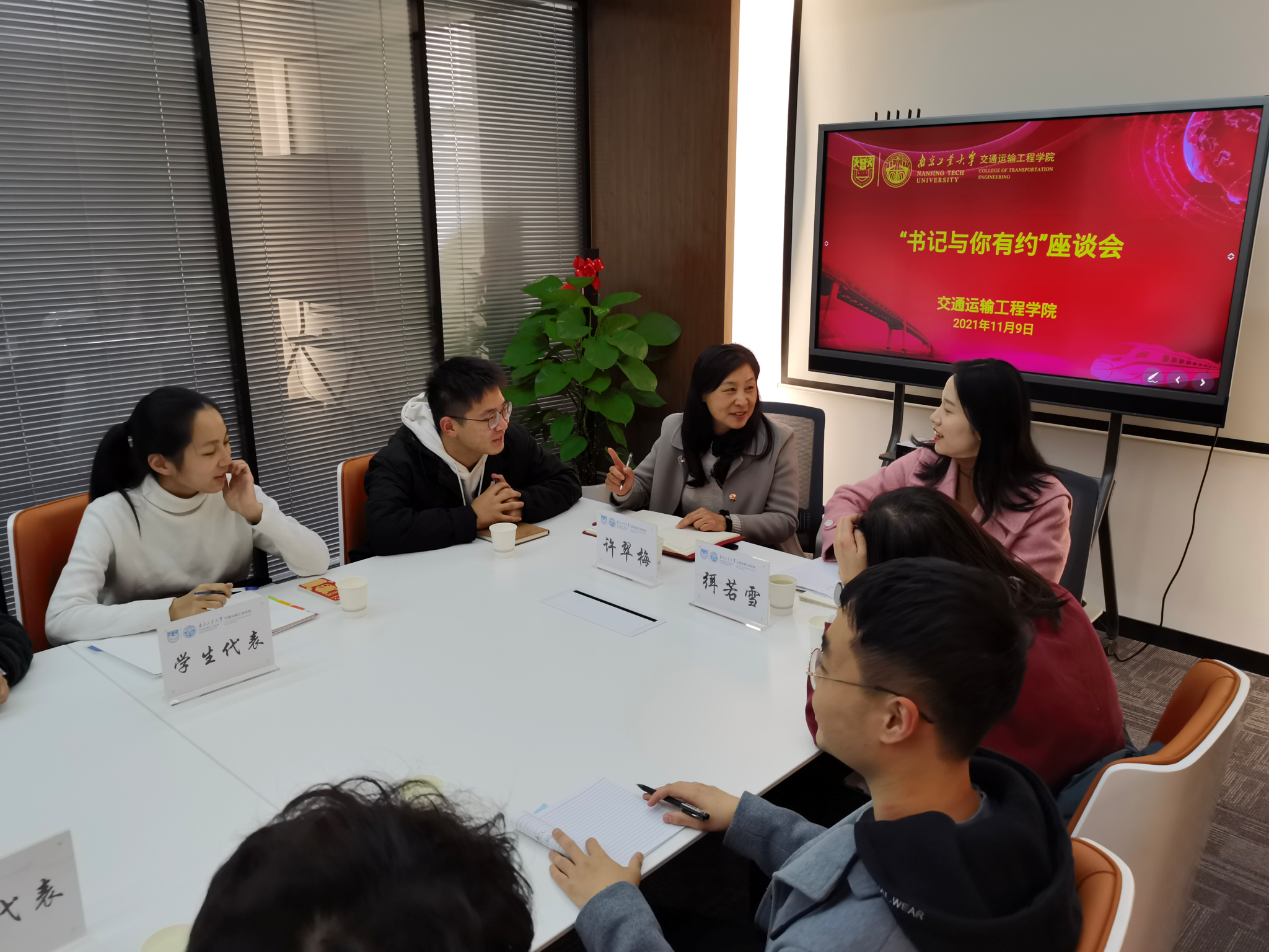 为深入了解2021级新生班级情况,深入与员工开展谈心谈话。11月9日上午,公司在天工楼412会议室召开“书记与你有约”座谈会。公司党委书记许翠梅、新生辅导员弭若雪与所联系班级交通2101班班委围绕班级管理、学涯规划等内容进行座谈。