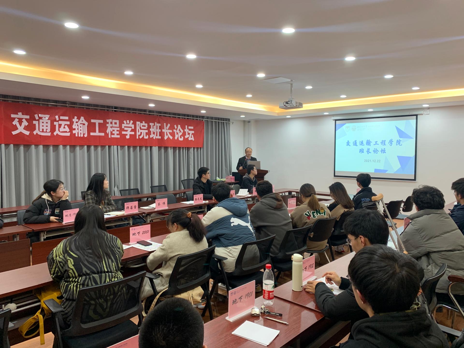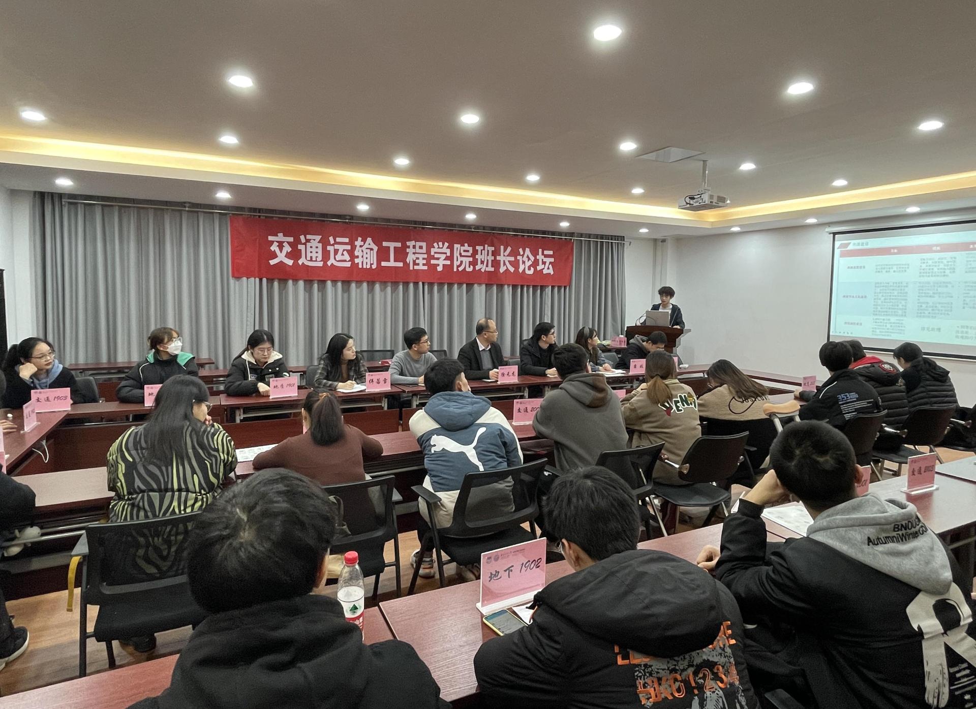 学办主任蔡伟老师结合论坛主题强调了加强班级建设的意义。各班级班长依次上台分享在班级建设中的经验、遇到的问题及解决方法,获得2020-2021学年“校先进班级”荣誉的交通1903班班长孙春敏就如何创建先进班级分享了班级建设经验,她提倡各班级要立足学情实际、确立建设目标、打造特色亮点、争创先进班级。作为大类分流班级代表,铁道2001班班长葛丁阳分享了在班级建设中严抓考勤、导学督学促学的经验,班级学风建设成效显著。