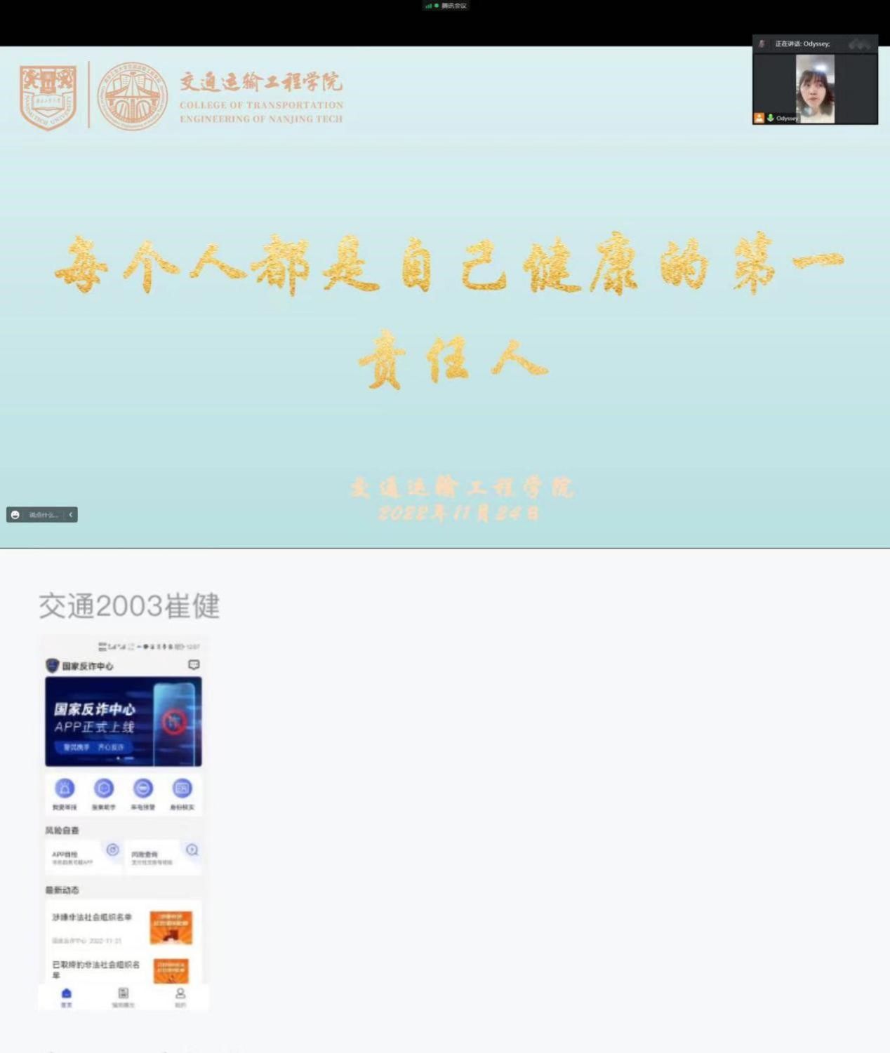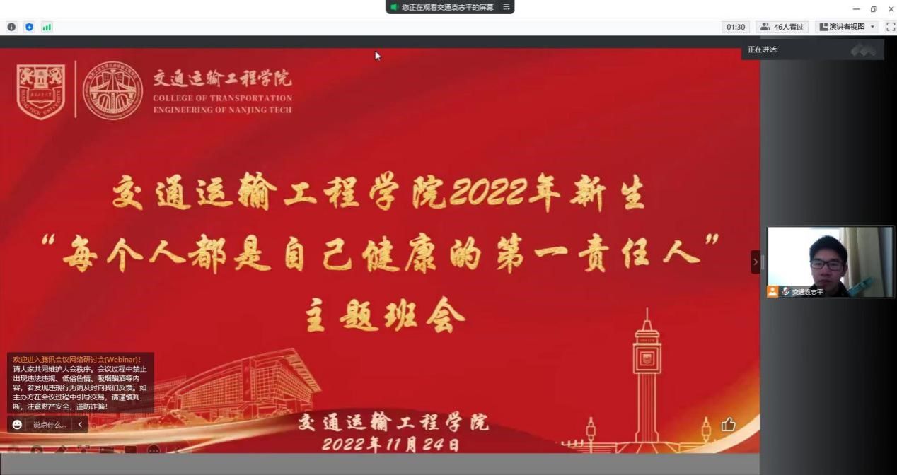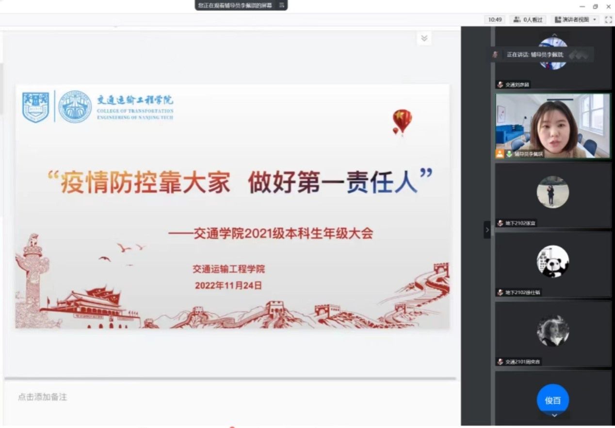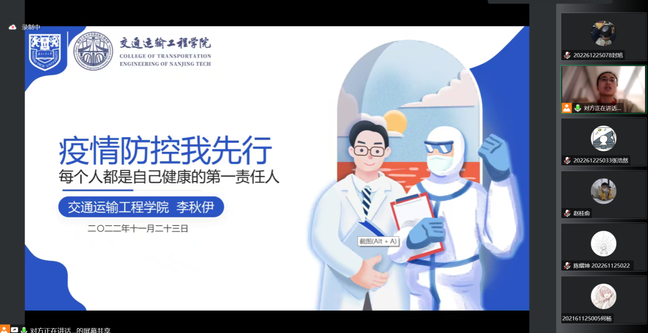 近期,南京地区尤其是公司所在江北新区疫情防控形势严峻复杂,公司周边已出现阳性感染者活动轨迹,为坚决做好校园疫情常态化防控工作,进一步增强全体员工疫情防控意识,公司各年级采用线上会议组织召开“每个人都是自己健康的第一责任人”主题班会,会议由各年级辅导员主持。