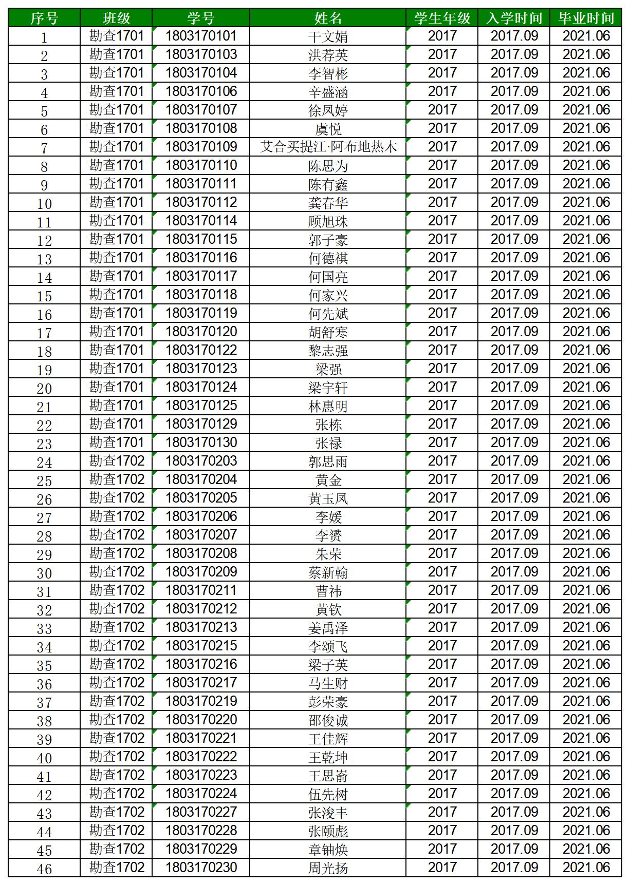 太阳成集团122ccvip2021届地质工程专业毕业生名单
