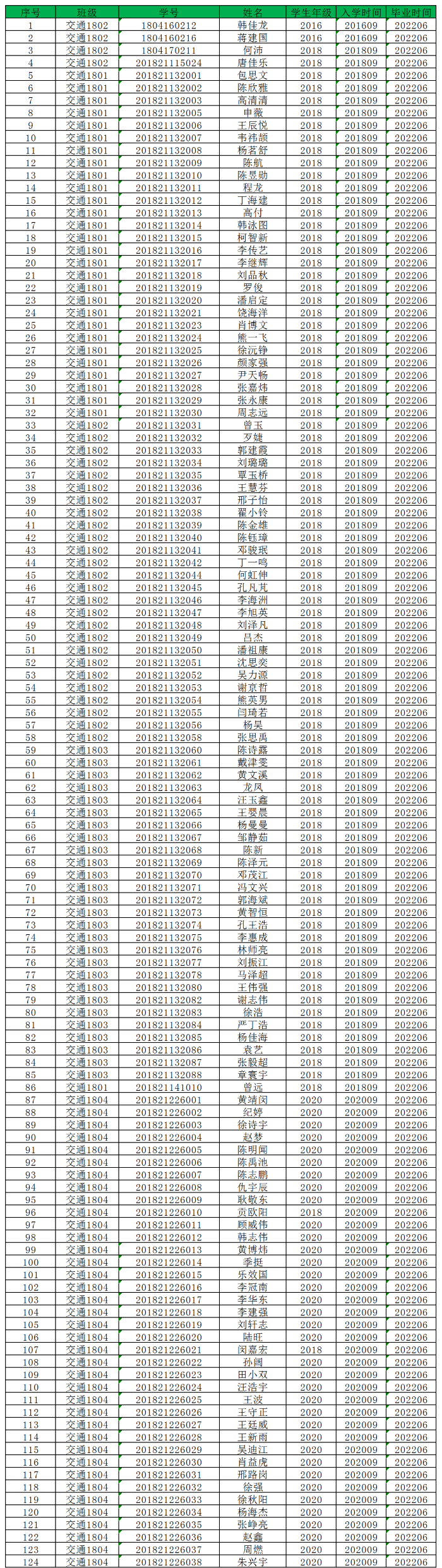 太阳成集团122ccvip2022届交通工程专业毕业生名单
