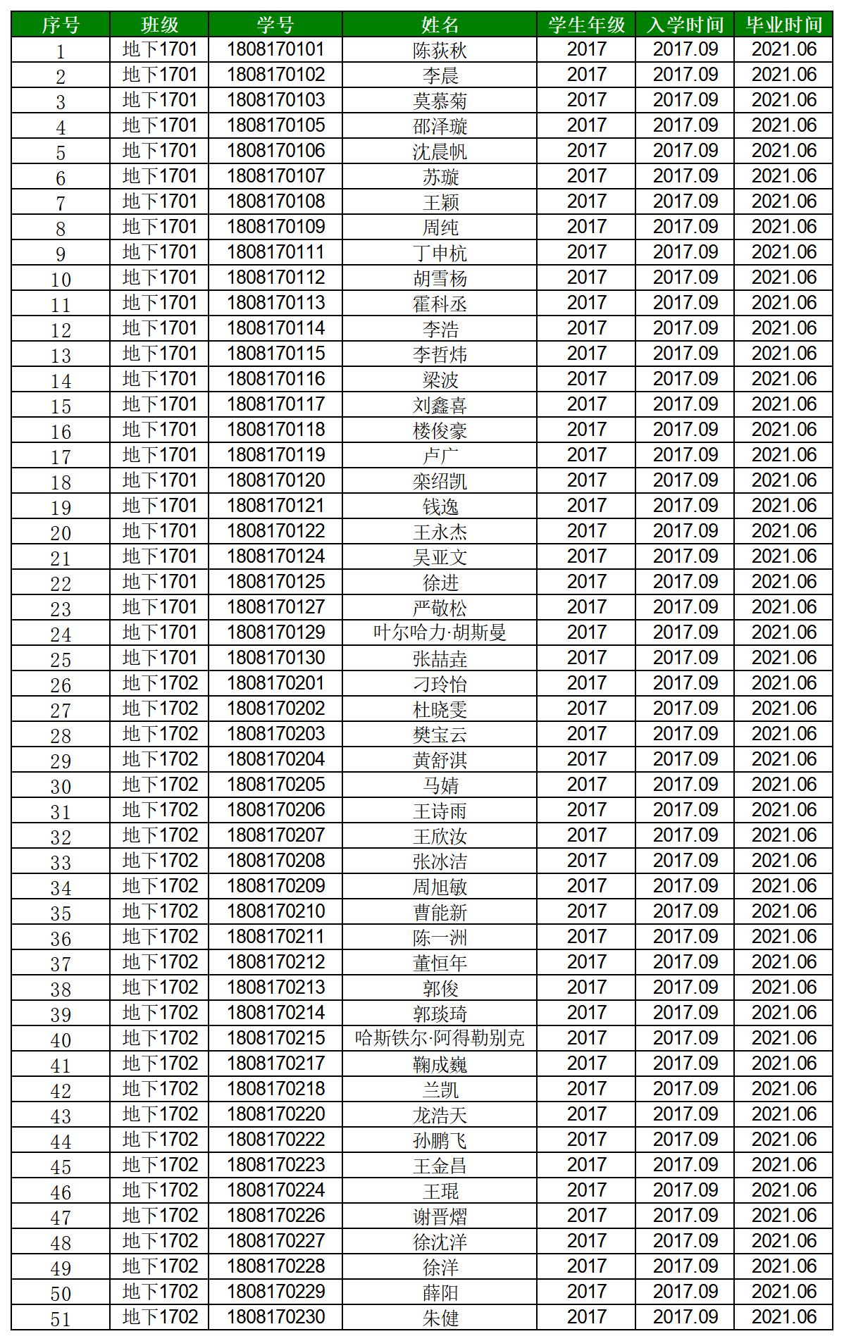 太阳成集团122ccvip2021届城市地下空间工程专业毕业生名单