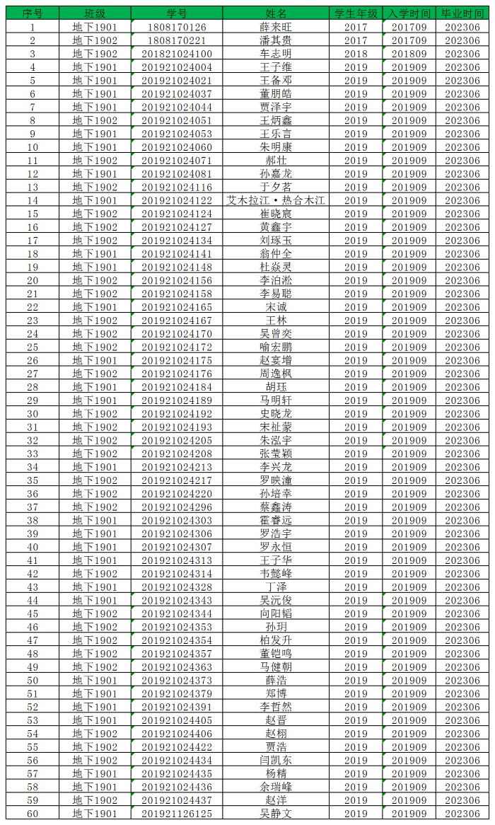 太阳成集团122ccvip2023届城市地下空间工程专业毕业生名单