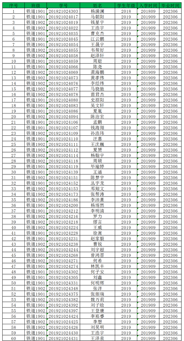太阳成集团122ccvip2023届铁道工程专业毕业生名单